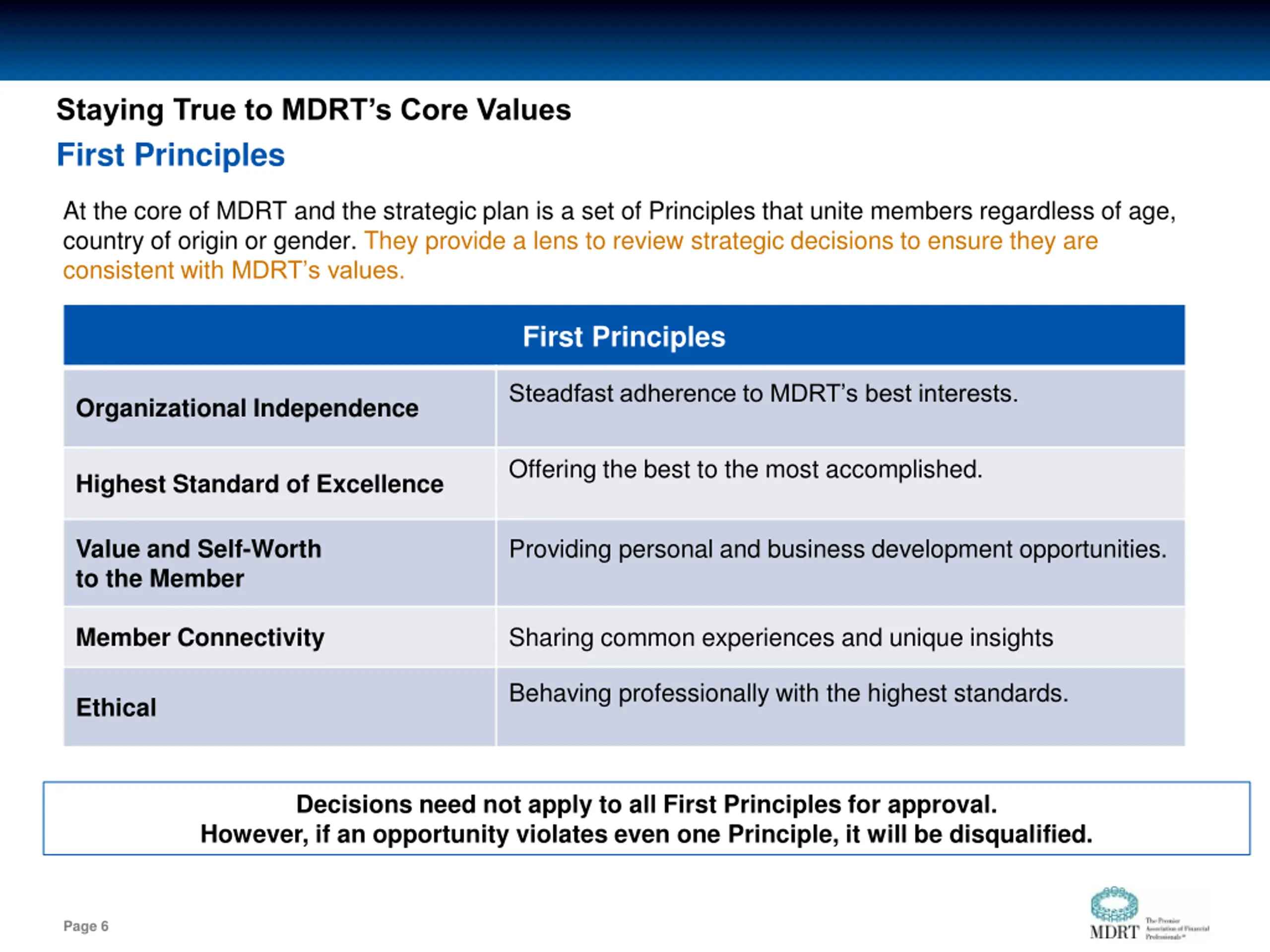 Staying True to MDRTs Core Values First Principles At the core of MDRT and the strategic plan is a set of Principles that unite members regardless of age, country of origin or gender. They provide a lens to review strategic decisions to ensure they are consistent with MDRT s values. First Principles Steadfast adherence to MDRT s best interests. Organizational Independence Offering the best to the most accomplished. Highest Standard of Excellence Providing personal and business development opportunities. Value and Self-Worth to the Member Sharing common experiences and unique insights Member Connectivity Behaving professionally with the highest standards. Ethical Decisions need not apply to all First Principles for approval. However, if an opportunity violates even one Principle, it will be disqualified. LIMITED ACCESS Page 6