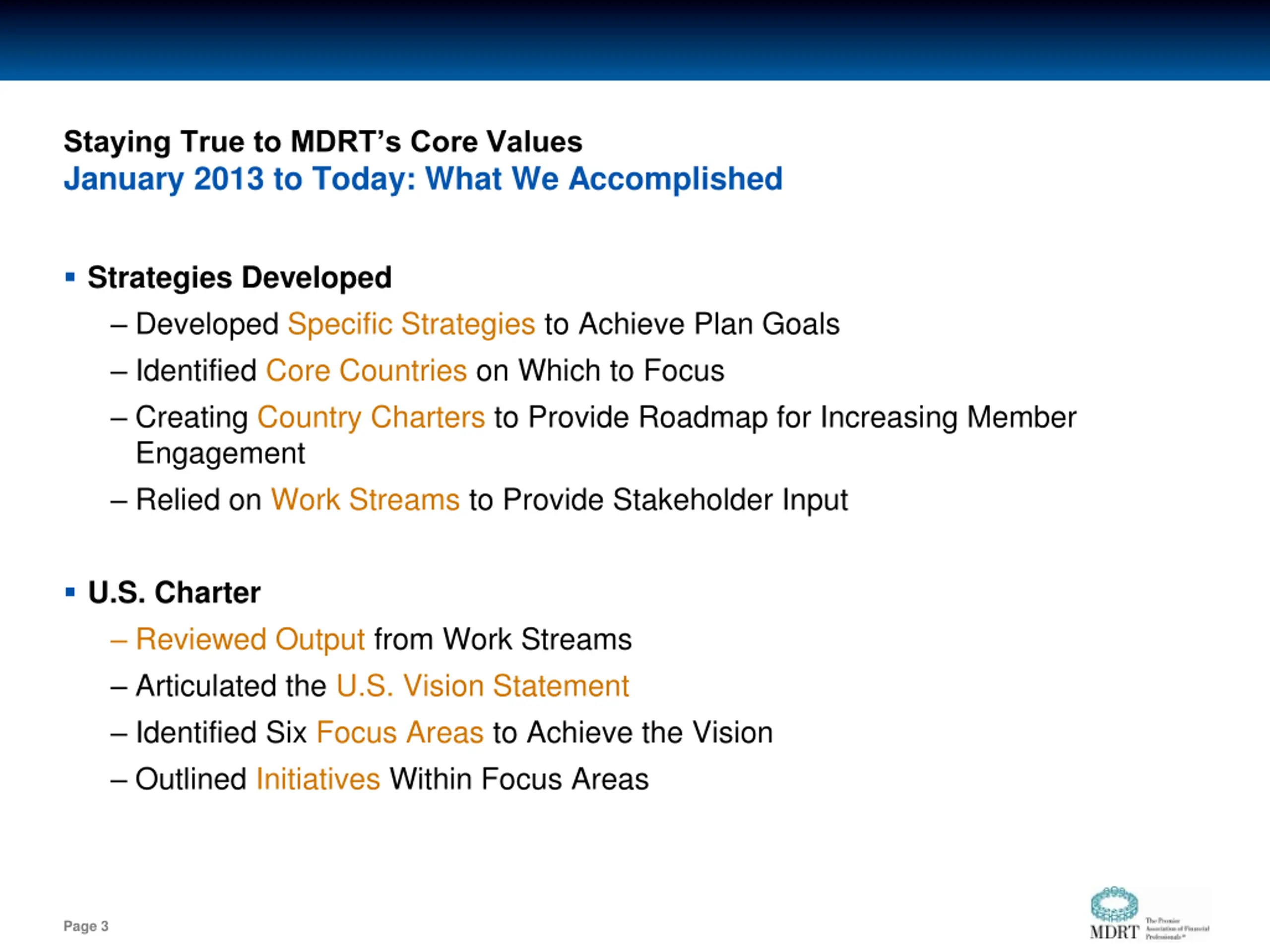 Staying True to MDRTs Core Values January 2013 to Today: What We Accomplished Staying True to MDRT s Core Values Reaffirmed Mission Articulated First Principles to Guide Decision Making Strategic Objectives Developed Charter Statements to Summarize Broad Strategic Plan Goals Visualized MDRT s Value Proposition (Member Engagement Illustration) Integrated Member Segments Chosen Focus Created Global Platforms LIMITED ACCESS Page 2