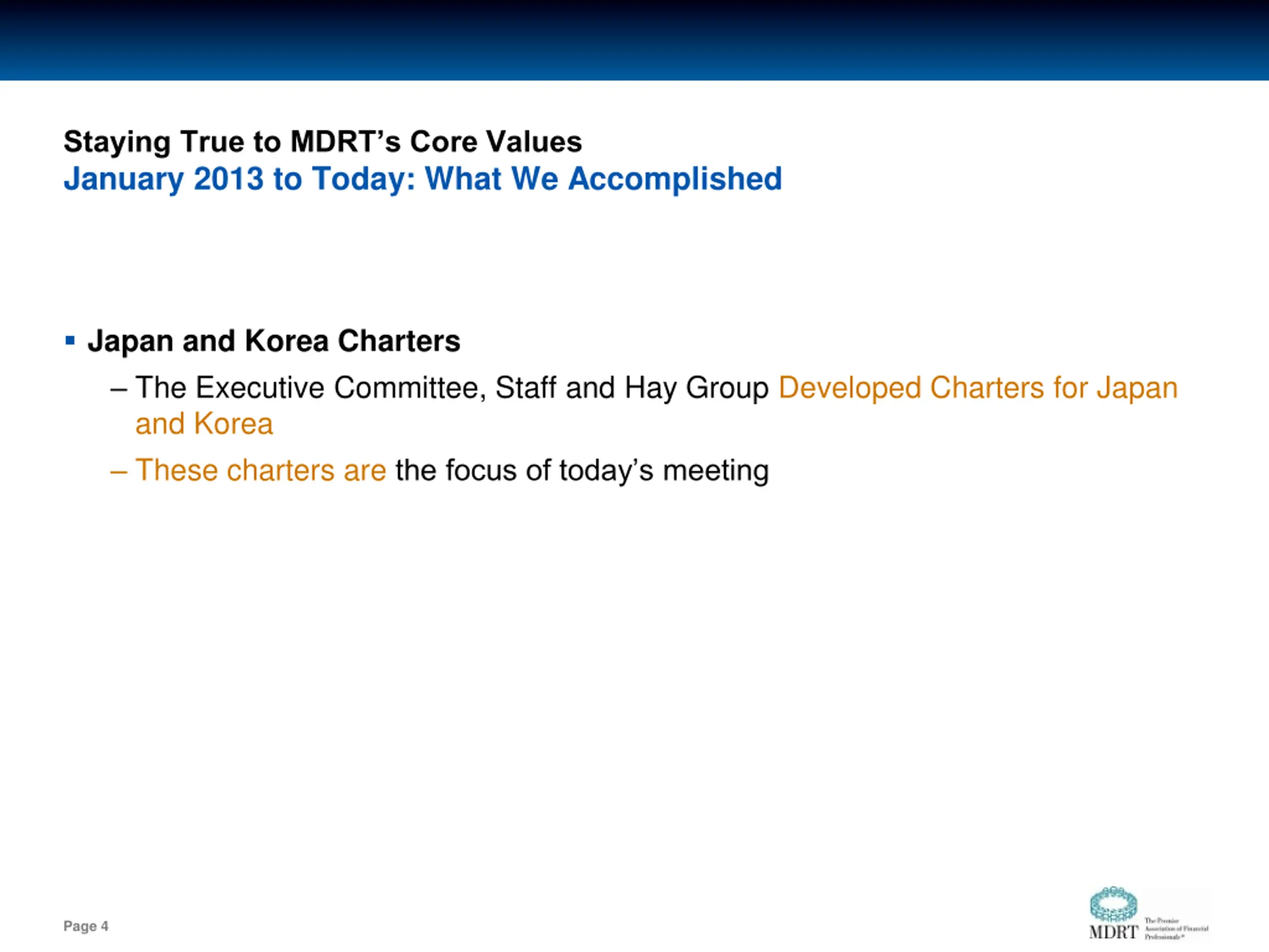 Staying True to MDRTs Core Values January 2013 to Today: What We Accomplished Japan and Korea Charters The Executive Committee, Staff and Hay Group Developed Charters for Japan and Korea These charters are the focus of today s meeting LIMITED ACCESS Page 4