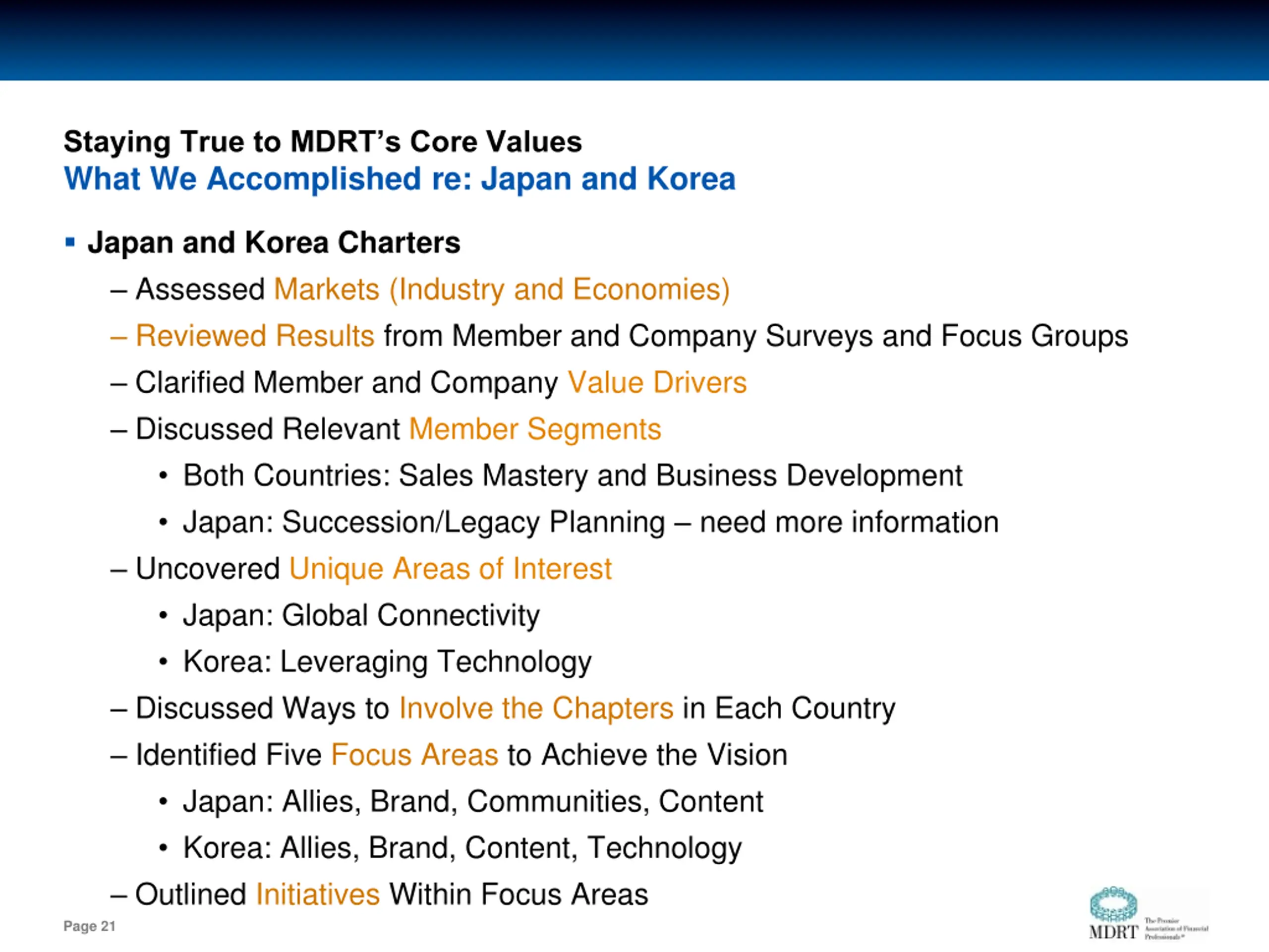 Japan and Korea Charters Achieving the Vision: Japan and Korea Focus Areas The Focus Areas are how the strategic planning vision is realized, specifically and uniquely, in Japan and Korea. They were created to help MDRT increase Japanese and Korean member engagement throughout career stages. The Focus Areas are also Japanese and Korean manifestations of the Global Platforms. LIMITED ACCESS Page 22