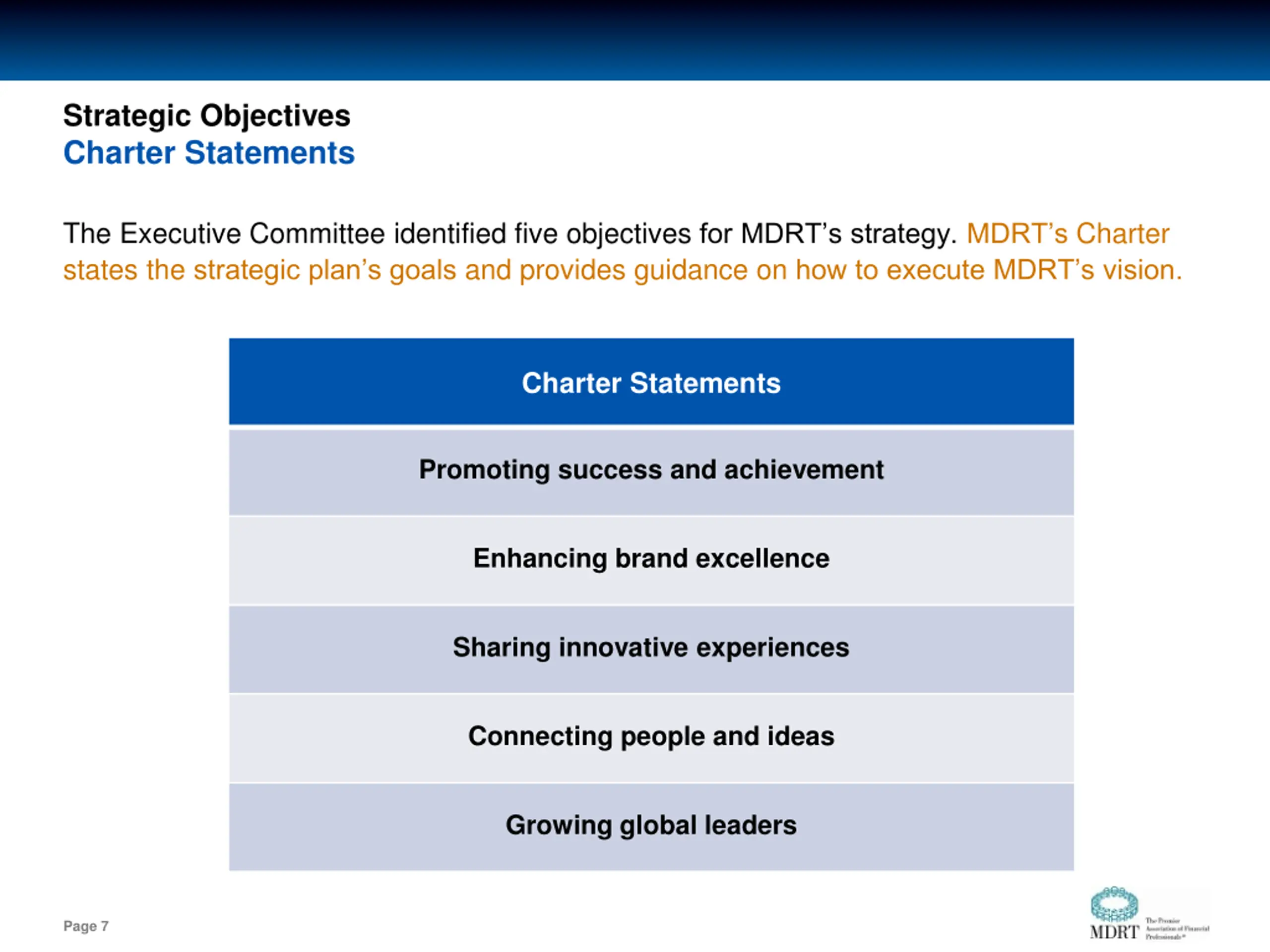 Strategic Objectives Charter Statements The Executive Committee identified five objectives for MDRT s strategy. MDRT s Charter states the strategic plan s goals and provides guidance on how to execute MDRT s vision. Charter Statements Promoting success and achievement Enhancing brand excellence Sharing innovative experiences Connecting people and ideas Growing global leaders LIMITED ACCESS Page 7