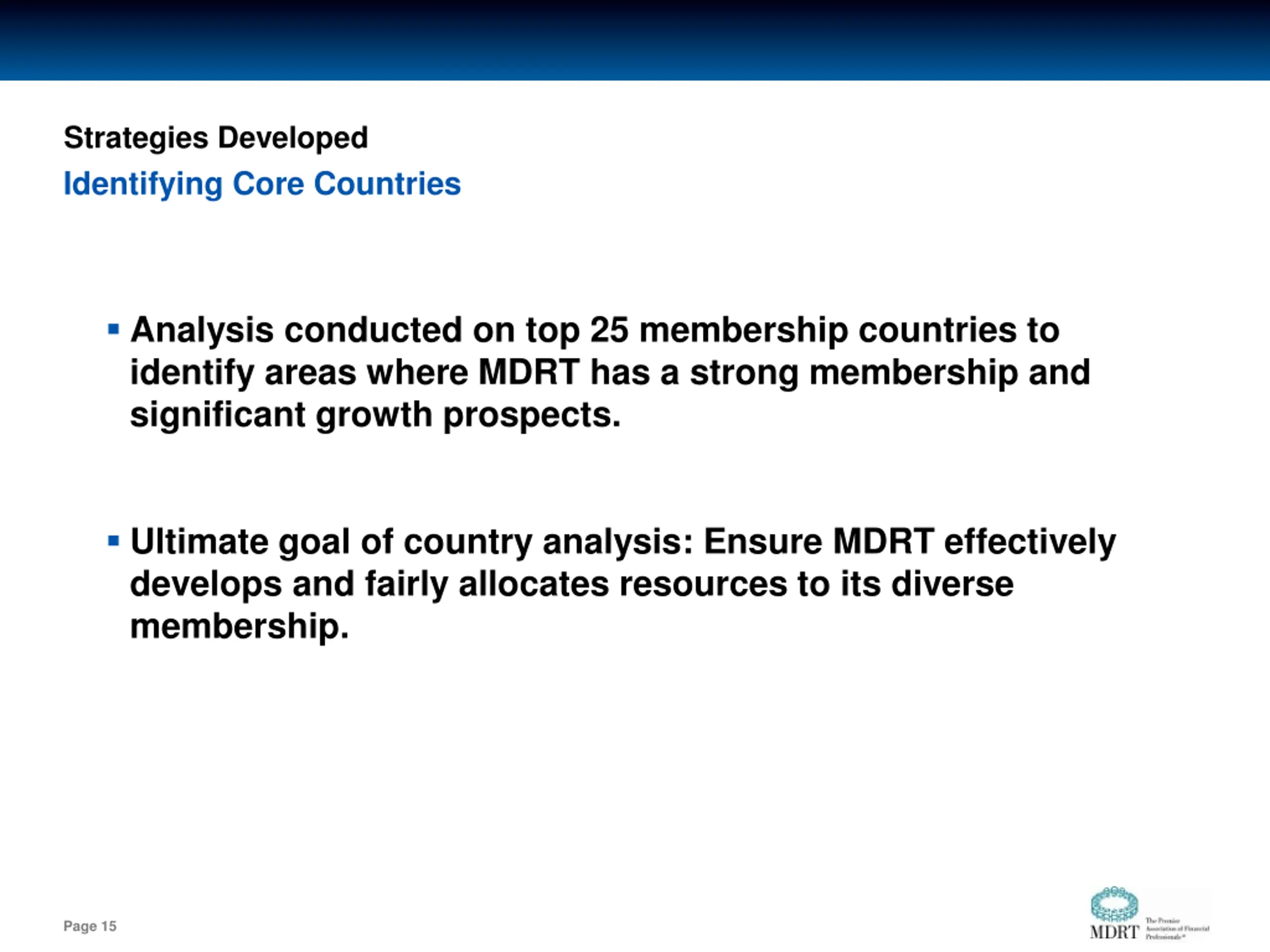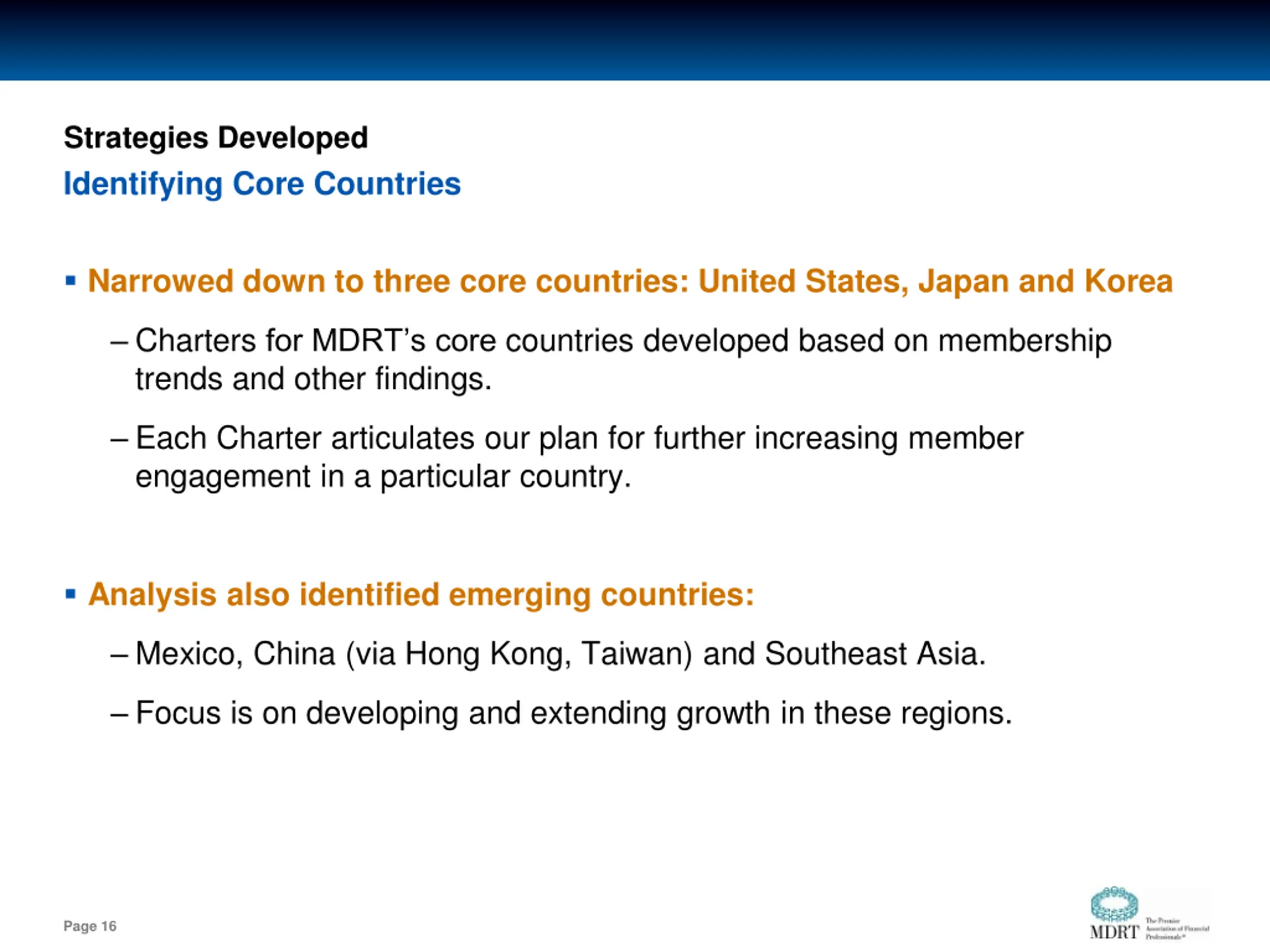 Strategies Developed Identifying Core Countries Analysis conducted on top 25 membership countries to identify areas where MDRT has a strong membership and significant growth prospects. Ultimate goal of country analysis: Ensure MDRT effectively develops and fairly allocates resources to its diverse membership. LIMITED ACCESS Page 15
