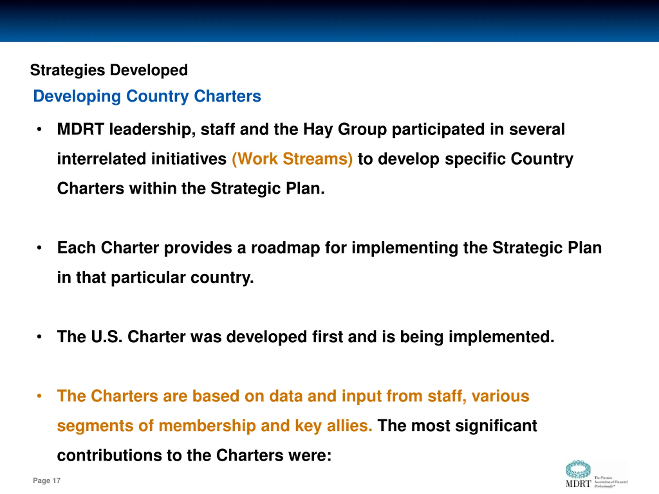 Strategies Developed Developing Country Charters MDRT leadership, staff and the Hay Group participated in several interrelated initiatives (Work Streams) to develop specific Country Charters within the Strategic Plan. Each Charter provides a roadmap for implementing the Strategic Plan in that particular country. The U.S. Charter was developed first and is being implemented. The Charters are based on data and input from staff, various segments of membership and key allies. The most significant contributions to the Charters were: LIMITED ACCESS Page 17