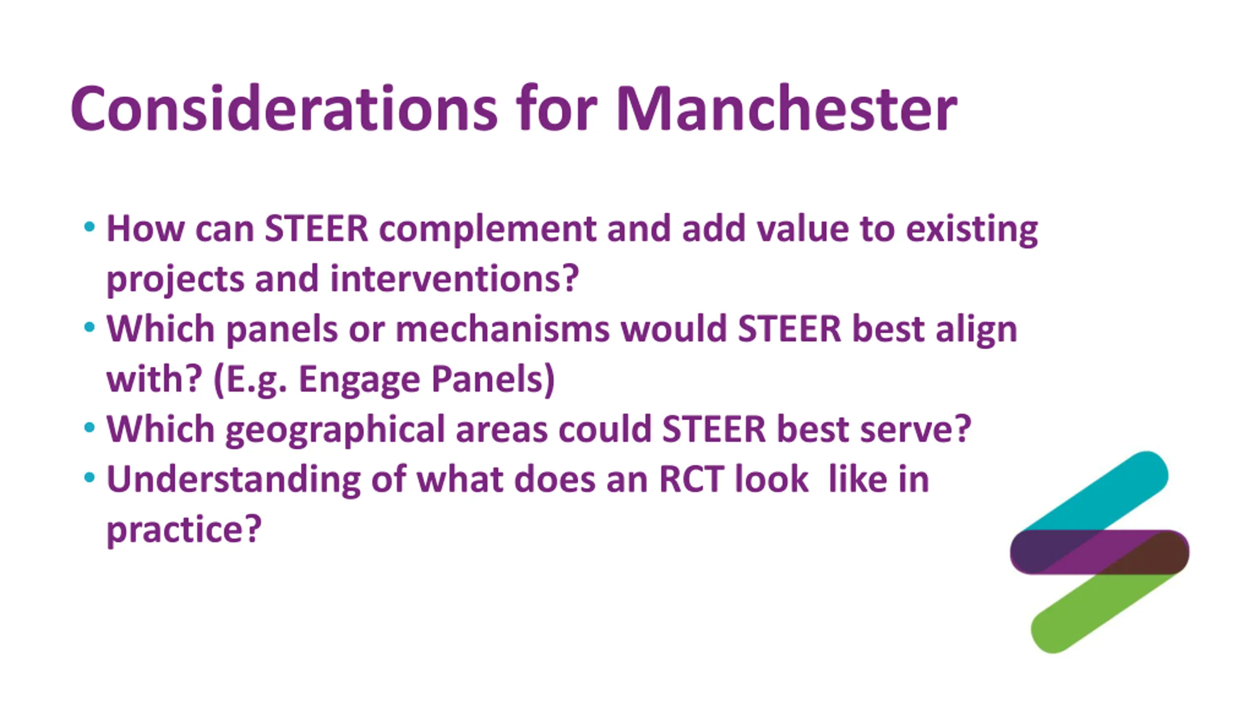 Considerations for Manchester How can STEER complement and add value to existing projects and interventions? Which panels or mechanisms would STEER best align with? (E.g. Engage Panels) Which geographical areas could STEER best serve? Understanding of what does an RCT look like in practice?