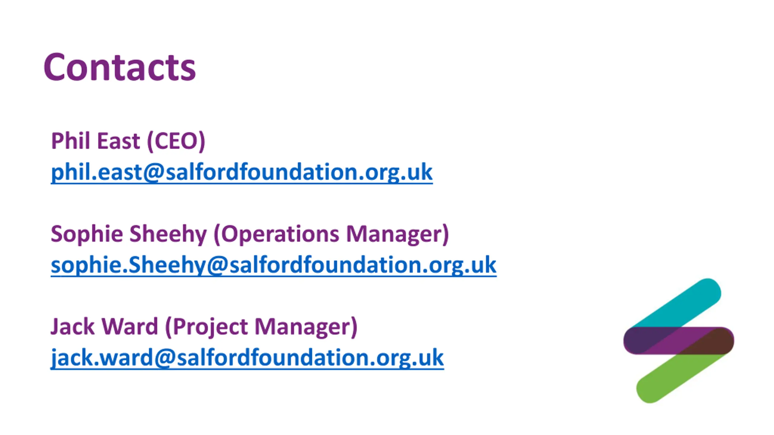 Contacts Phil East (CEO) phil.east@salfordfoundation.org.uk Sophie Sheehy (Operations Manager) sophie.Sheehy@salfordfoundation.org.uk Jack Ward (Project Manager) jack.ward@salfordfoundation.org.uk