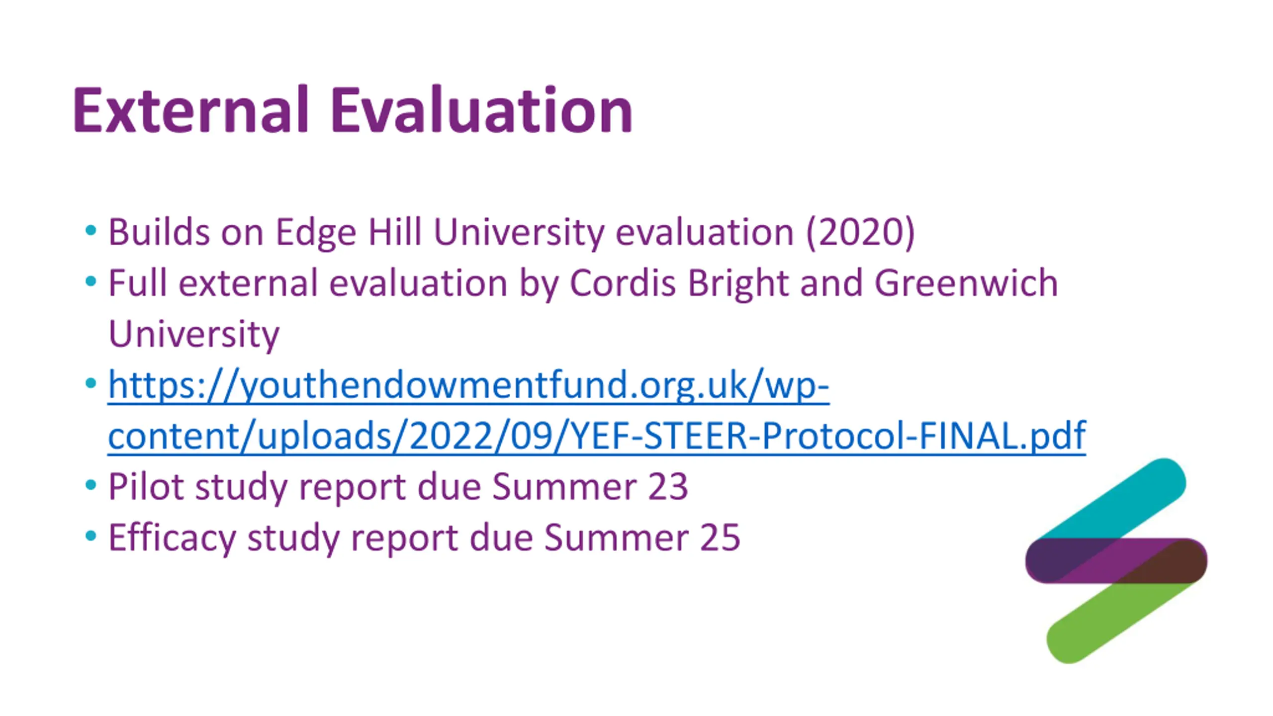 External Evaluation Builds on Edge Hill University evaluation (2020) Full external evaluation by Cordis Bright and Greenwich University https://youthendowmentfund.org.uk/wp- content/uploads/2022/09/YEF-STEER-Protocol-FINAL.pdf Pilot study report due Summer 23 Efficacy study report due Summer 25
