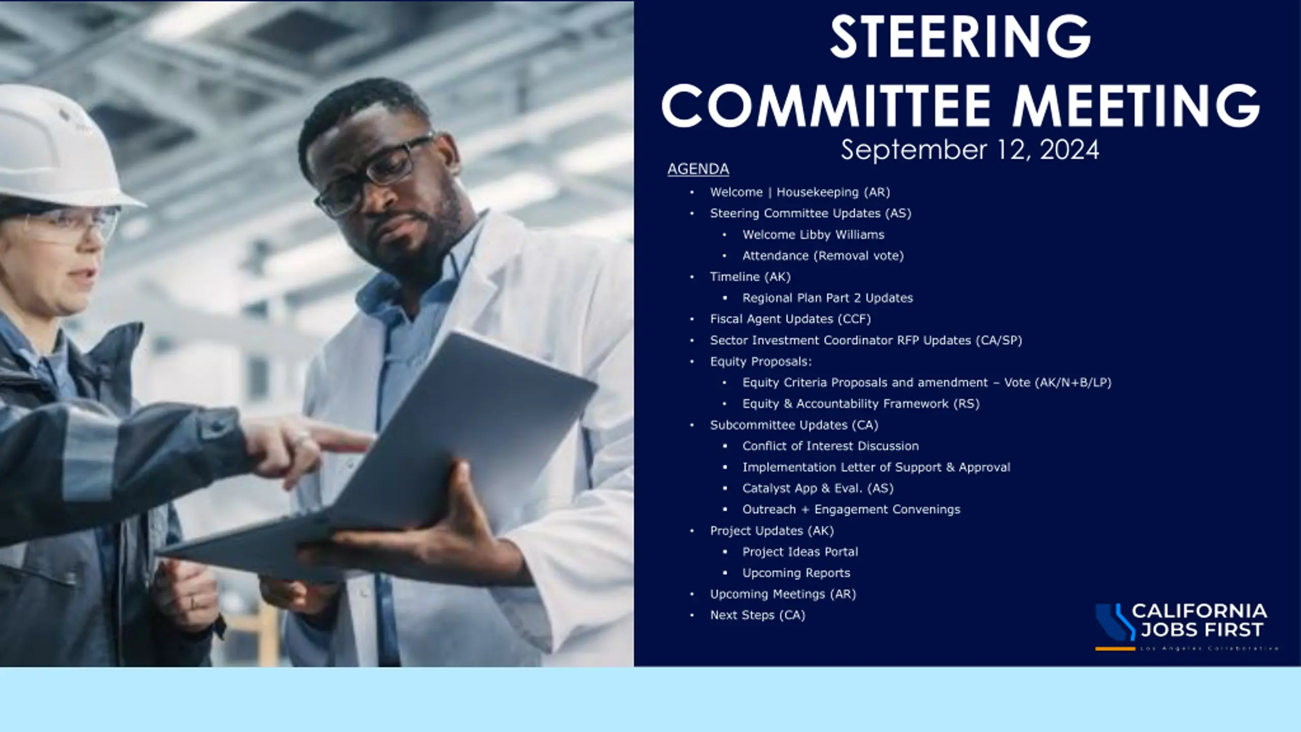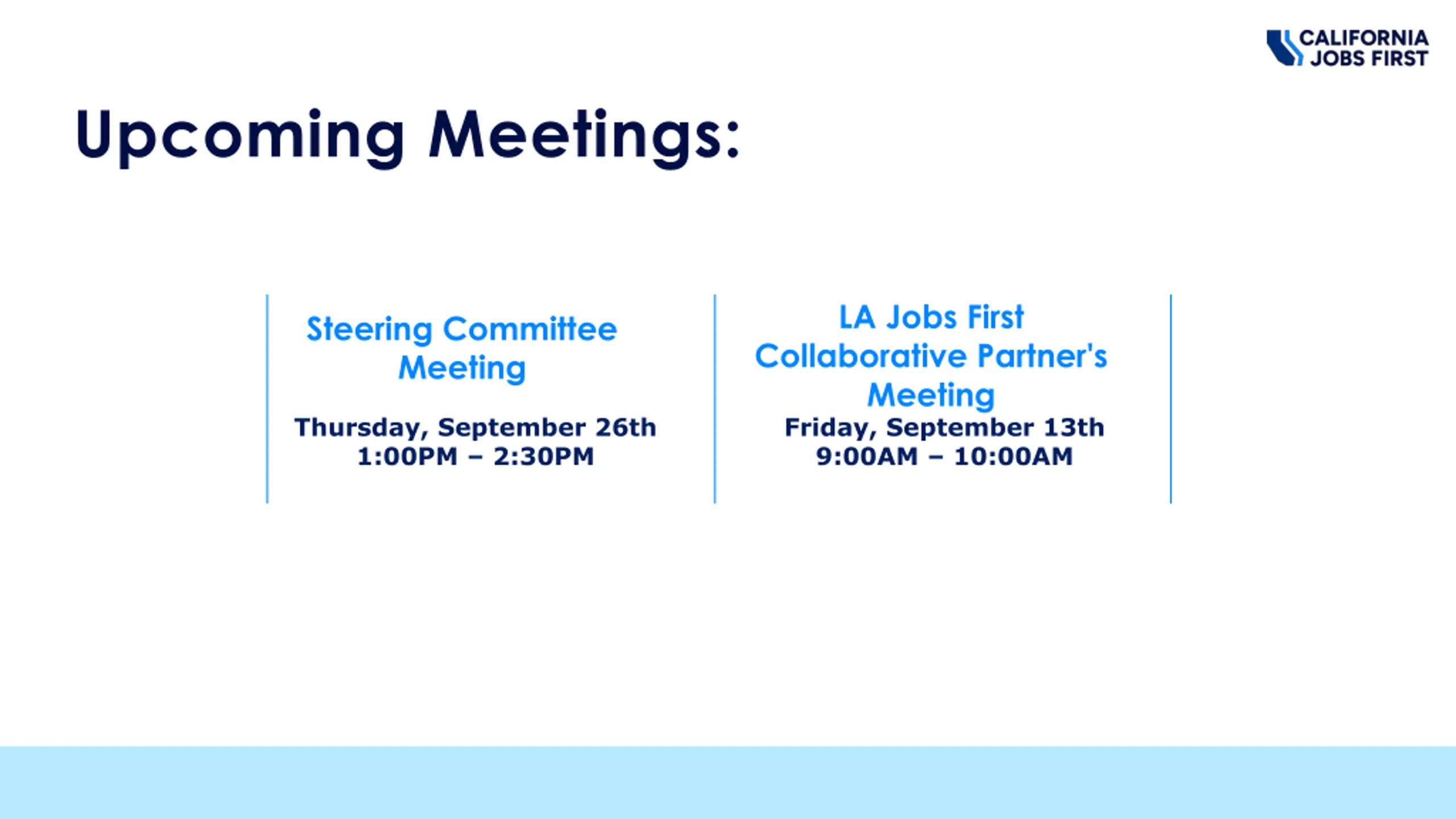 Upcoming Meetings: LA Jobs First Collaborative Partner's Meeting Friday, September 13th 9:00AM 10:00AM Steering Committee Meeting Thursday, September 26th 1:00PM 2:30PM