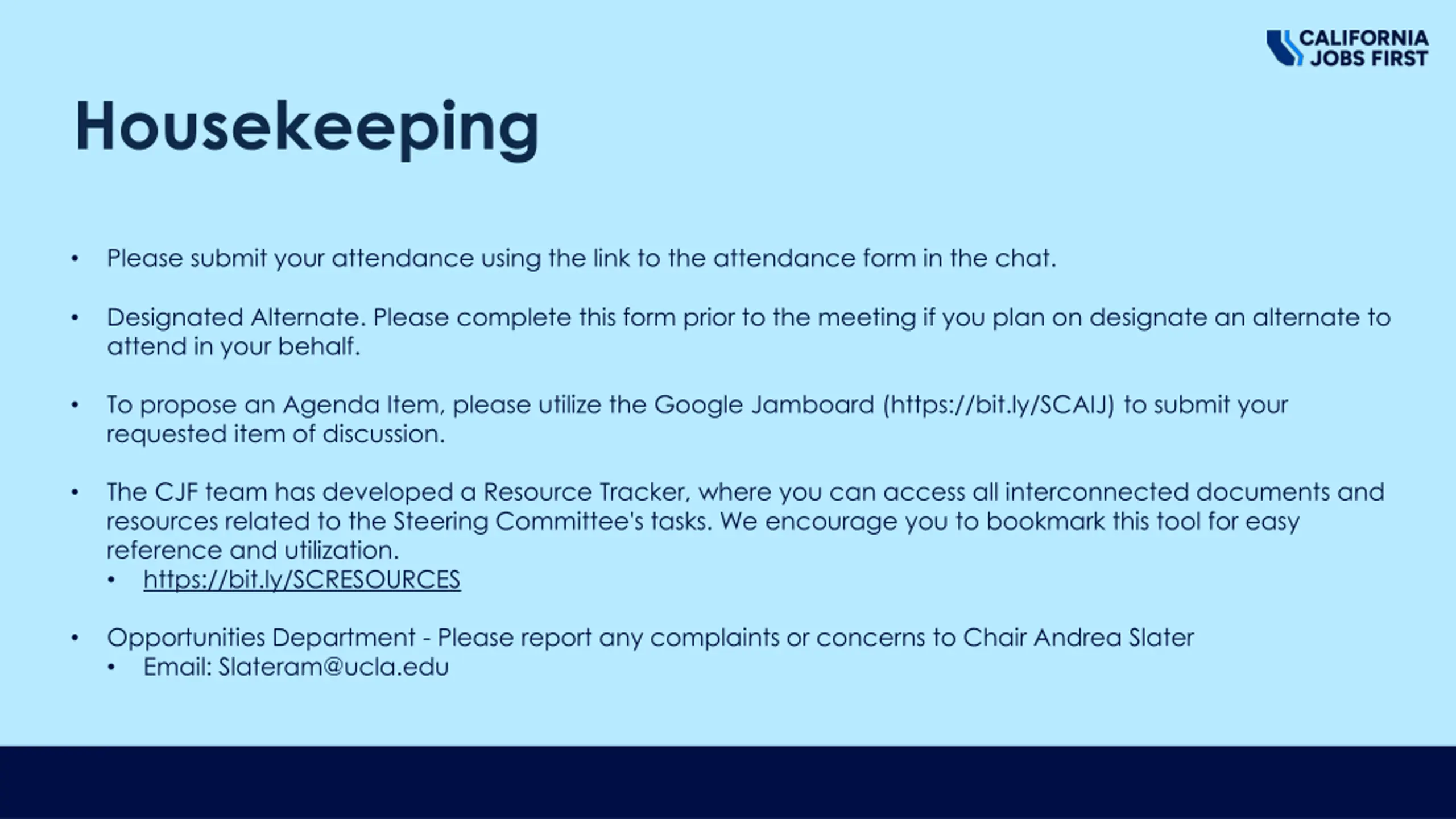 Housekeeping Please submit your attendance using the link to the attendance form in the chat. Designated Alternate. Please complete this form prior to the meeting if you plan on designate an alternate to attend in your behalf. To propose an Agenda Item, please utilize the Google Jamboard (https://bit.ly/SCAIJ) to submit your requested item of discussion. The CJF team has developed a Resource Tracker, where you can access all interconnected documents and resources related to the Steering Committee's tasks. We encourage you to bookmark this tool for easy reference and utilization. https://bit.ly/SCRESOURCES Opportunities Department - Please report any complaints or concerns to Chair Andrea Slater Email: Slateram@ucla.edu