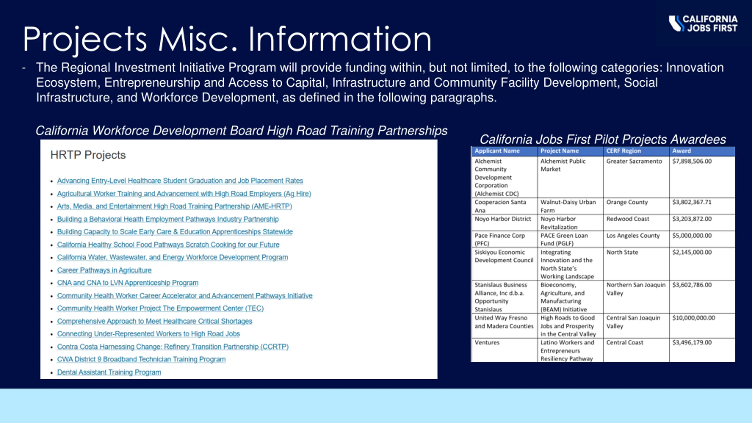 Projects Misc. Information - The Regional Investment Initiative Program will provide funding within, but not limited, to the following categories: Innovation Ecosystem, Entrepreneurship and Access to Capital, Infrastructure and Community Facility Development, Social Infrastructure, and Workforce Development, as defined in the following paragraphs. California Workforce Development Board High Road Training Partnerships California Jobs First Pilot Projects Awardees