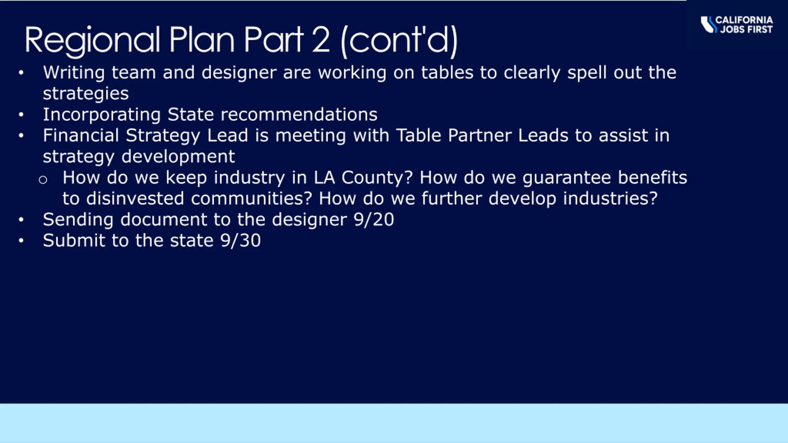 Regional Plan Part 2 (cont'd) Writing team and designer are working on tables to clearly spell out the strategies Incorporating State recommendations Financial Strategy Lead is meeting with Table Partner Leads to assist in strategy development o How do we keep industry in LA County? How do we guarantee benefits to disinvested communities? How do we further develop industries? Sending document to the designer 9/20 Submit to the state 9/30