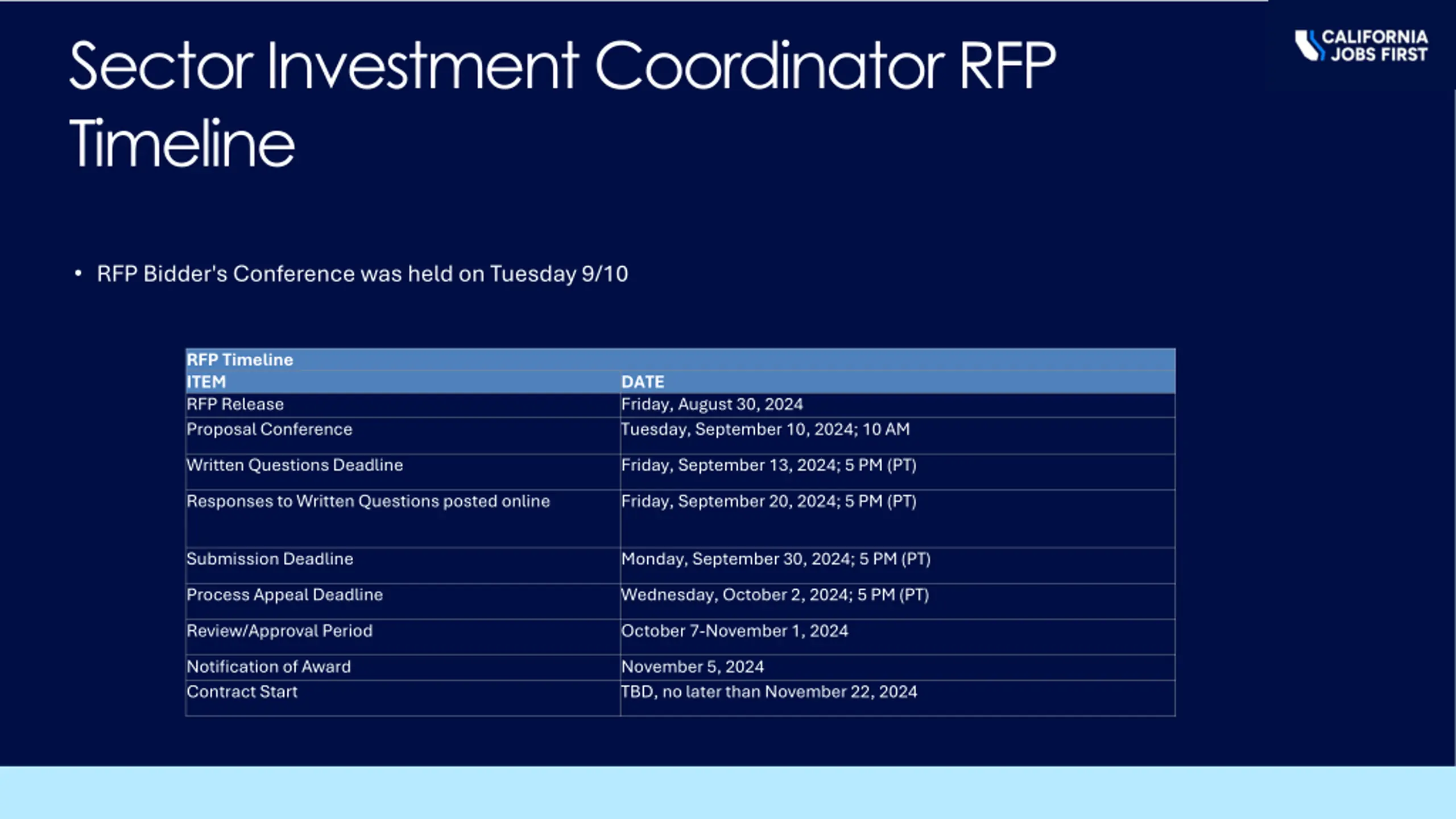 Sector Investment Coordinator RFP Timeline RFP Bidder's Conference was held on Tuesday 9/10 RFP Timeline ITEM RFP Release Proposal Conference DATE Friday, August 30, 2024 Tuesday, September 10, 2024; 10 AM Written Questions Deadline Friday, September 13, 2024; 5 PM (PT) Responses to Written Questions posted online Friday, September 20, 2024; 5 PM (PT) Submission Deadline Monday, September 30, 2024; 5 PM (PT) Process Appeal Deadline Wednesday, October 2, 2024; 5 PM (PT) Review/Approval Period October 7-November 1, 2024 Notification of Award Contract Start November 5, 2024 TBD, no later than November 22, 2024