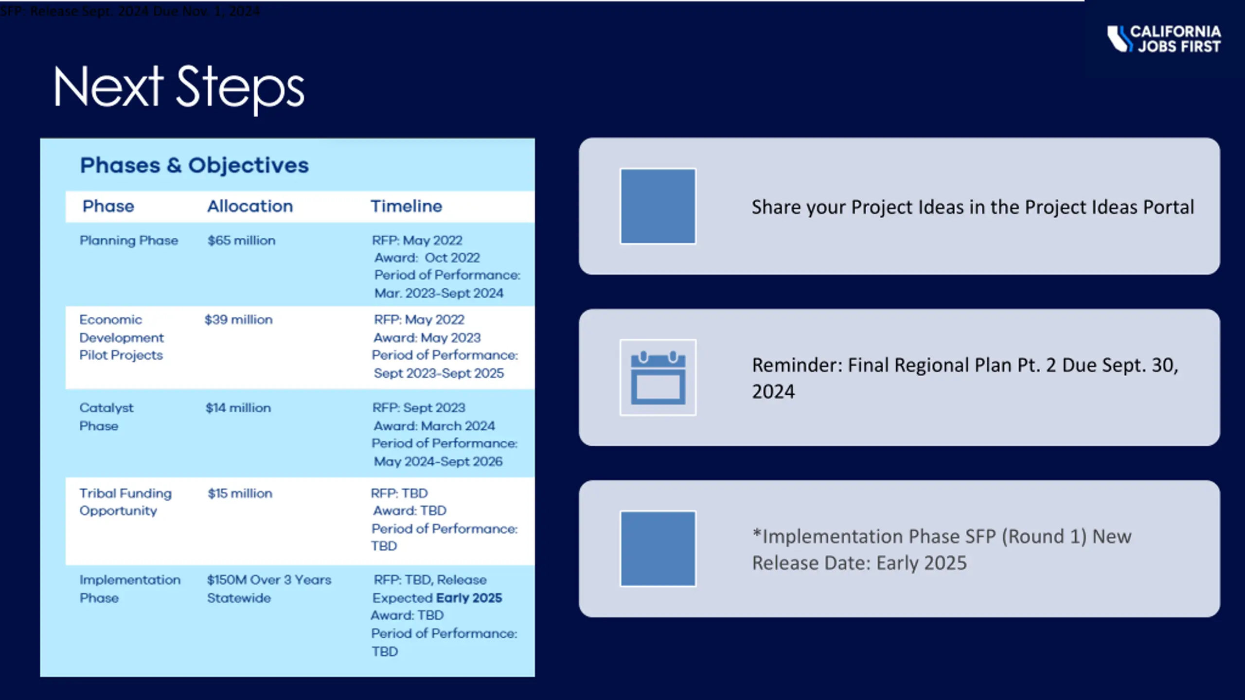 SFP: Release Sept. 2024 Due Nov. 1, 2024 Next Steps Share your Project Ideas in the Project Ideas Portal Reminder: Final Regional Plan Pt. 2 Due Sept. 30, 2024 *Implementation Phase SFP (Round 1) New Release Date: Early 2025