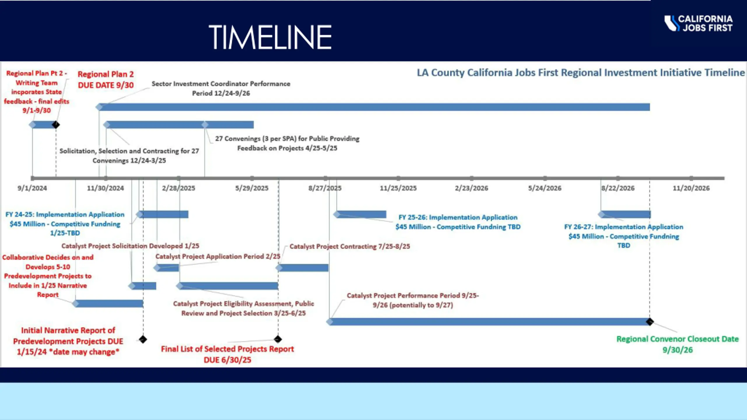 Regional Plan Part 2 Yet to receive a document with feedback, but state verbally provided feedback on 9/10 Feedback: Great job overall, nothing that the state is requiring us to change, but they provided recommendations Strengths: o Good analysis, feasible strategies, significant research and justification o Good focus on gender equity and benefits to disinvested communities Recommendations: o Spell out California Jobs First o Regional Investment Initiative instead of CERF o Move strategies to end of target sector sections o Strengthen alignment with state strategies o Narrow in on transportation & logistics by adding successful examples of guaranteed training programs o Enhance measures for integrating disinvested communities in workforce development along educational institutions