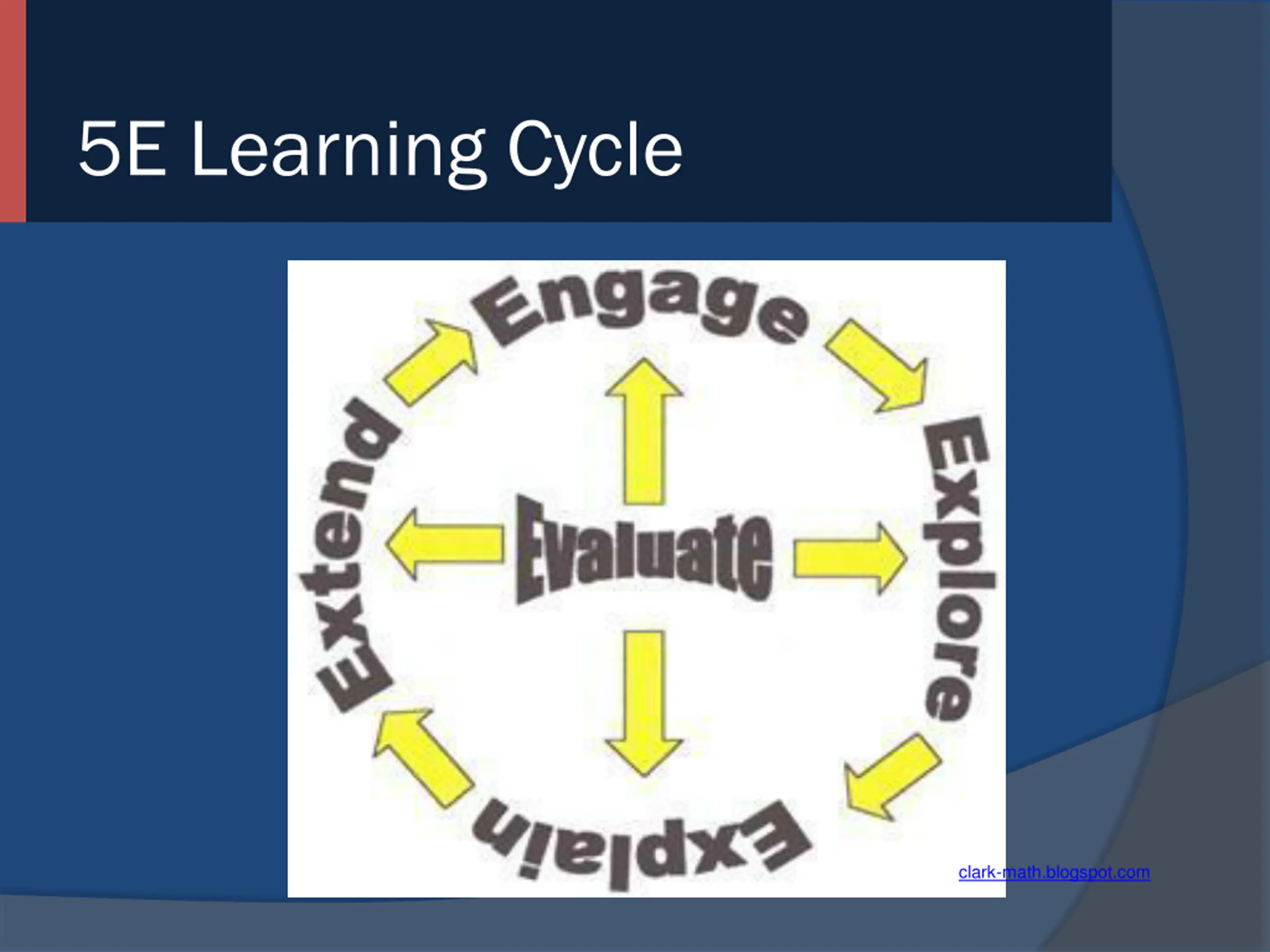5E Learning Cycle ENGAGE: capture students' interest with effective questioning EXPLORATION: activities that encourage focused exploration EXPLANATION: H.O.T. questions to solicit student explanations to justify exploration; vocabulary is introduced; teacher ASSISTS in explanation ELABORATION: develop understanding of concept; connect student's observation to terminology EVALUATION: demonstration of achievement - ongoing throughout lesson as well as at then end.