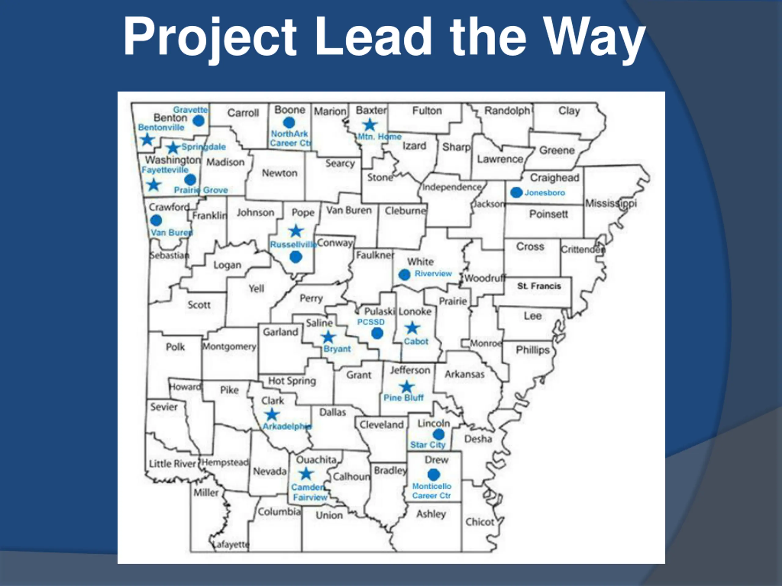 UTeach & New Tech High Schools Gravette SD Northark Technical Center Clay Fulton Benton Prairie Grove SD Carroll Randolph Boone Baxter Marion Sharp Jonesboro Greene SD Izard Lawrence Madison UAF Washington Newton Searcy Stone Craighead Mississippi Lincoln SD Russellville SD Independence Jackson Poinsett Crawford Van Buren Johnson Cross Co. SD Cleburne Franklin Riverview SD Pope Cross Conway White Crittenden Logan Sebastian Faulkner Woodruff St. Francis Yell UCA Perry Scott Prairie Lee Lonoke Pulaski UALR Monroe Saline Garland Montgomery Polk Phillips Hot Spring Arkansas Grant Jefferson Star City SD Pike Howard Clark Sevier Dallas Lincoln Cleveland Desha Hempstead Little River Nevada Ouachita Drew Calhoun Bradley Miller Chicot Lafayette Columbia Ashley Union