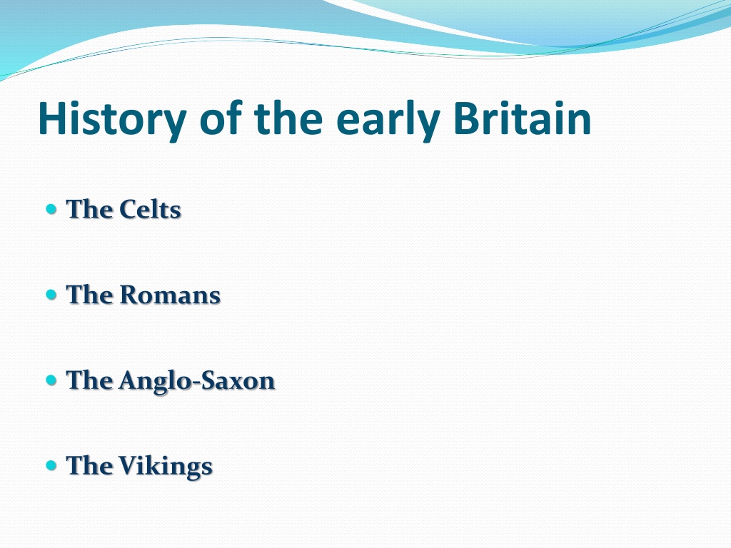 History of the early Britain The Celts The Romans The Anglo-Saxon The Vikings