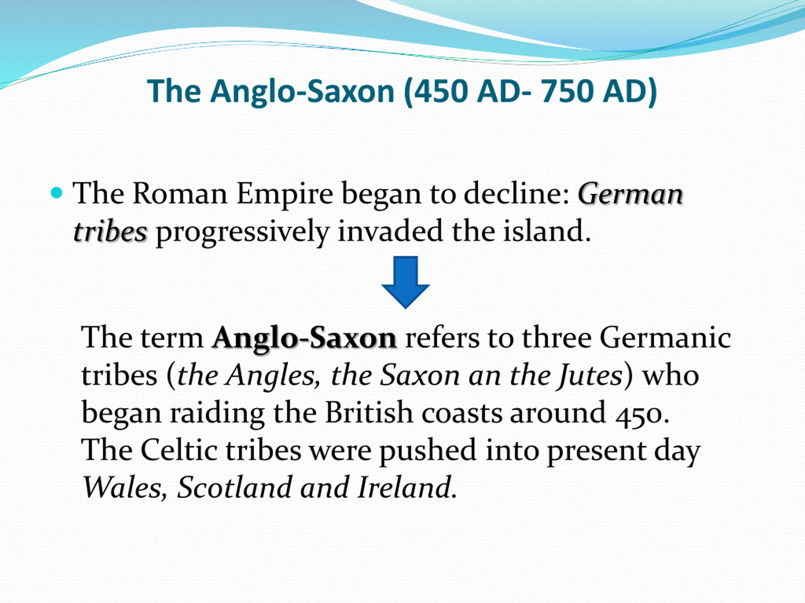 The Anglo-Saxon (450 AD- 750 AD) The Roman Empire began to decline: German tribes progressively invaded the island. The term Anglo-Saxon refers to three Germanic tribes (the Angles, the Saxon an the Jutes) who began raiding the British coasts around 450. The Celtic tribes were pushed into present day Wales, Scotland and Ireland.