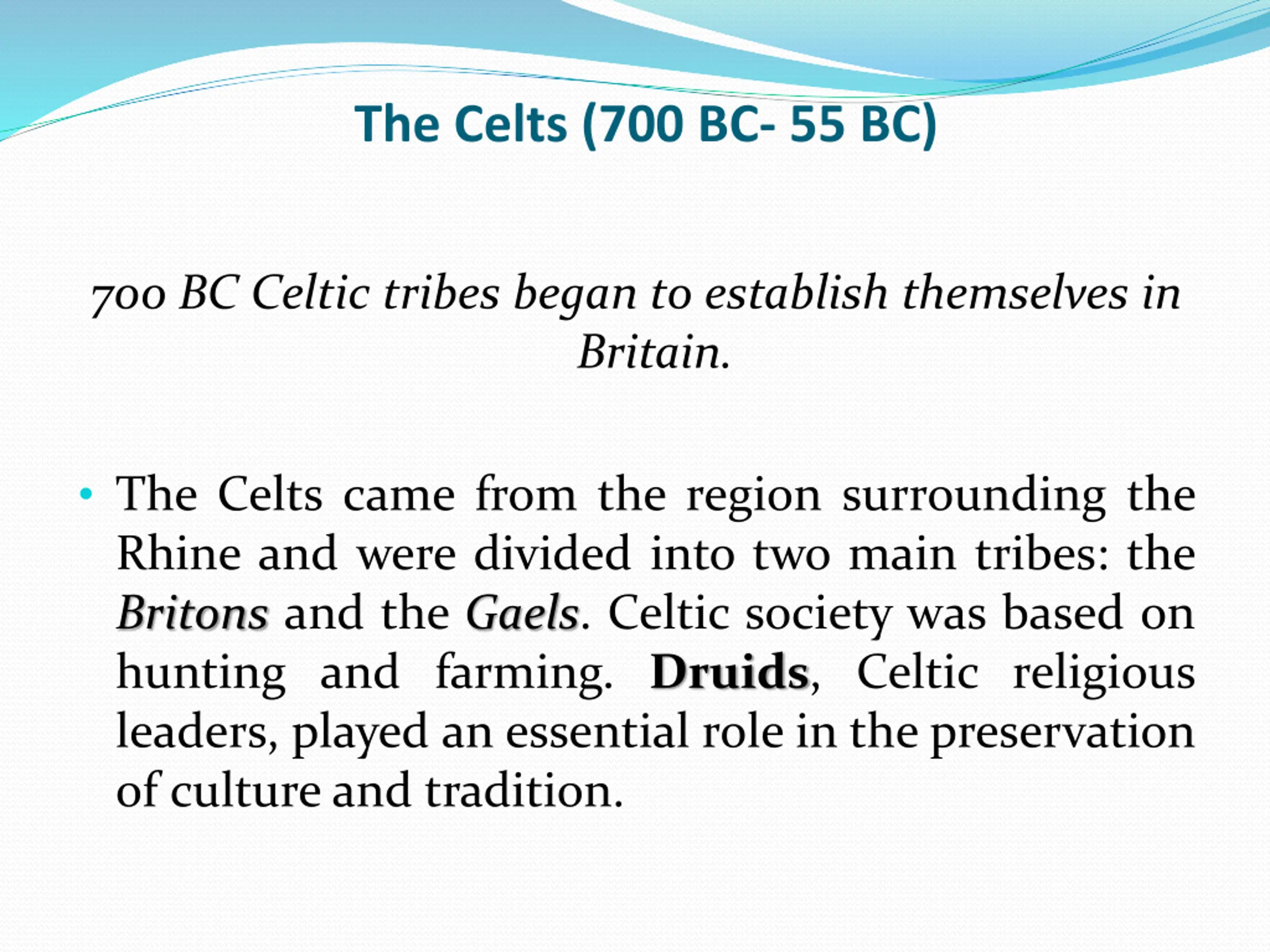 The Celts (700 BC- 55 BC) 700 BC Celtic tribes began to establish themselves in Britain. The Celts came from the region surrounding the Rhine and were divided into two main tribes: the Britons and the Gaels. Celtic society was based on hunting and farming. Druids, Celtic religious leaders, played an essential role in the preservation of culture and tradition.