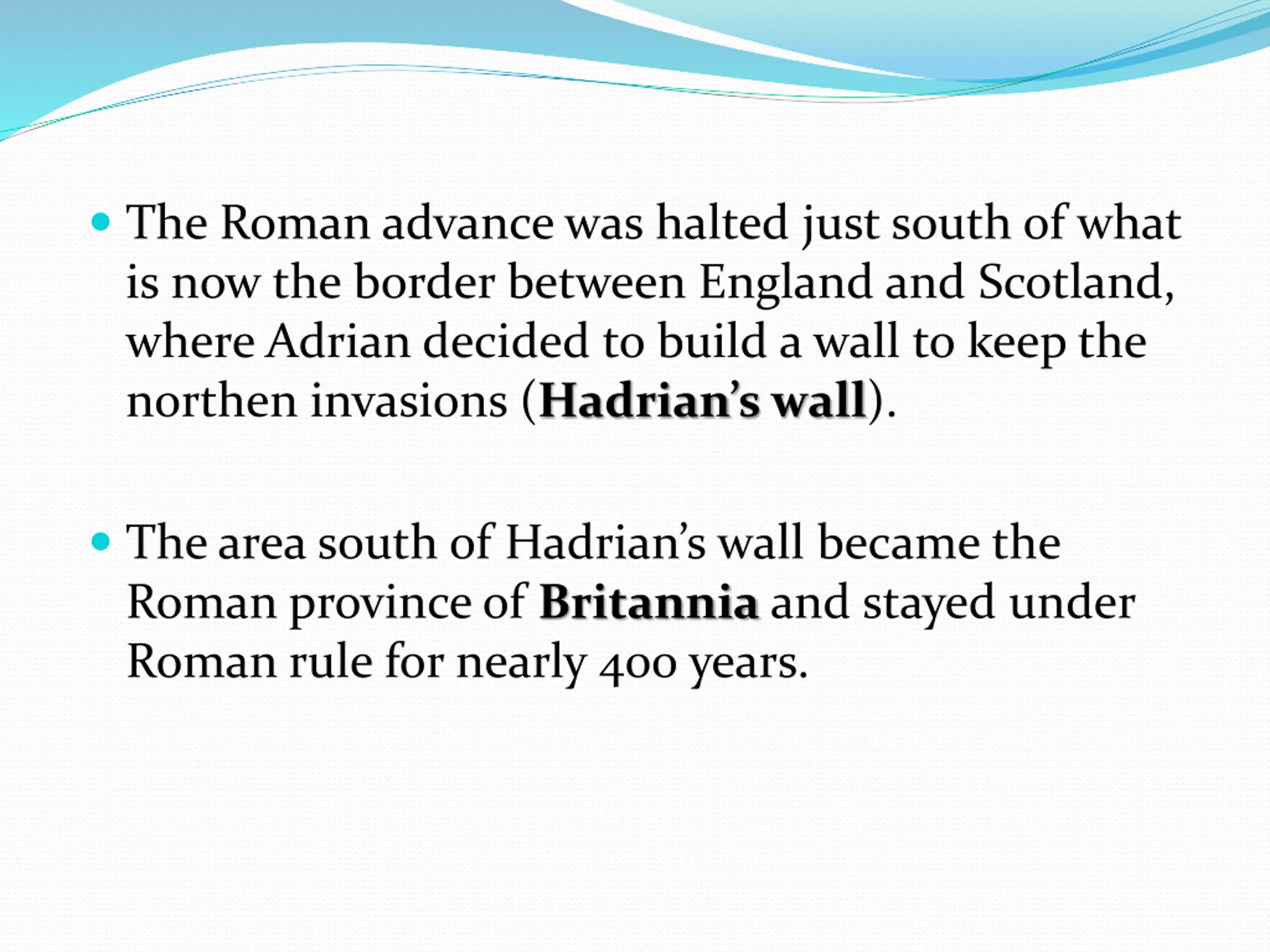 The Roman advancewas halted just south of what is now the border between England and Scotland, where Adrian decided to build a wall to keep the northen invasions (Hadrian s wall). The area south of Hadrian s wall became the Roman province of Britannia and stayed under Roman rule for nearly 400 years.