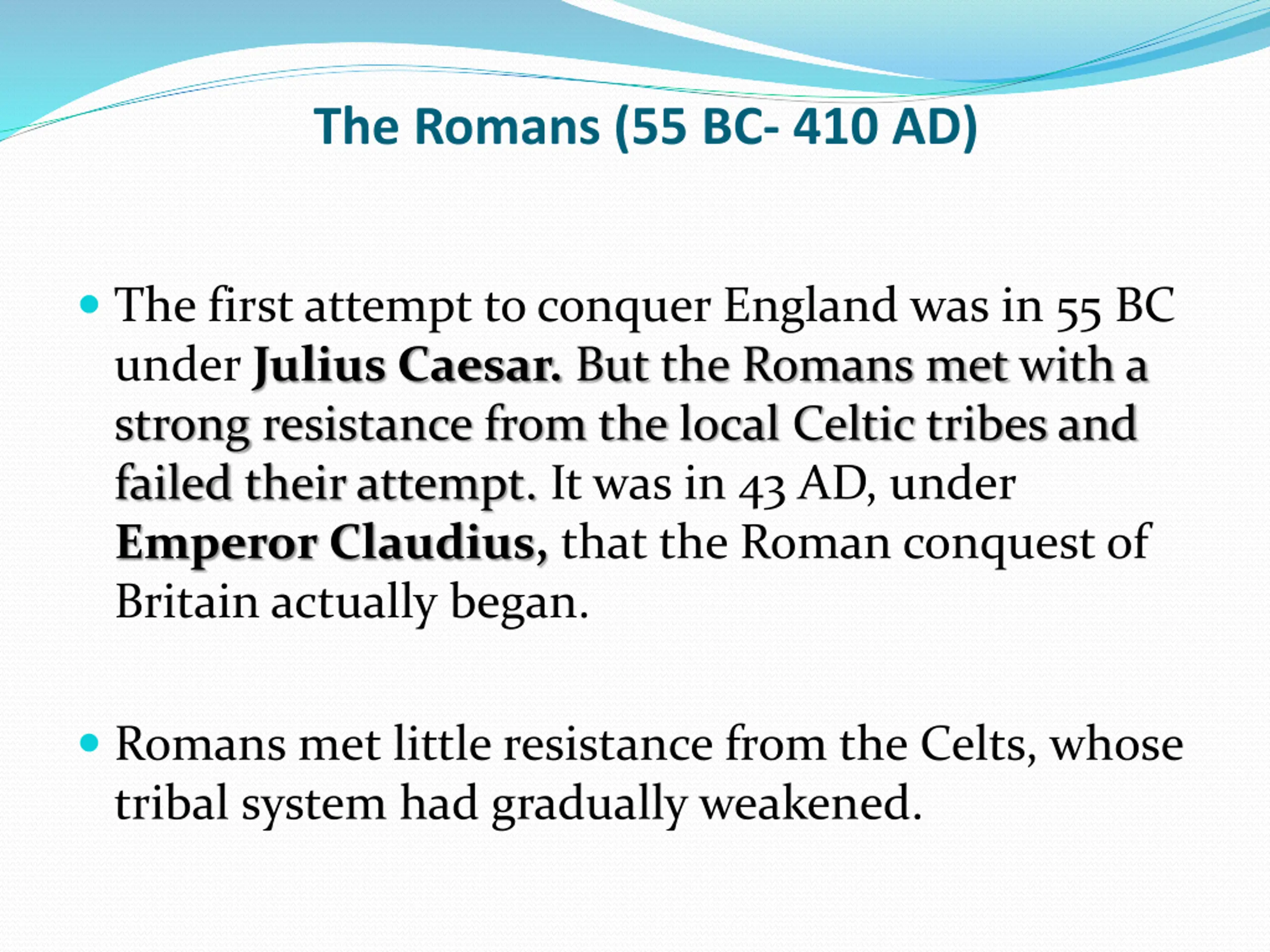 The Romans (55 BC- 410 AD) The first attempt to conquer England was in 55 BC under Julius Caesar. But the Romans met with a strong resistance from the local Celtic tribes and failed theirattempt. It was in 43 AD, under Emperor Claudius, that the Roman conquest of Britain actually began. Romans met little resistance from the Celts, whose tribal system had gradually weakened.