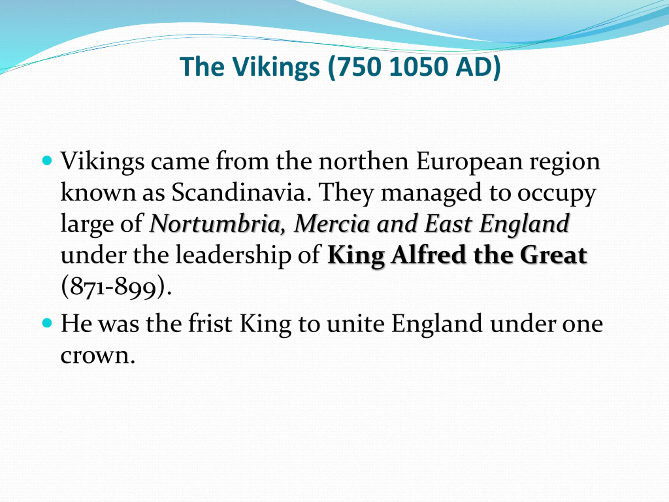 The Vikings (750 1050 AD) Vikings came from the northen European region known as Scandinavia. They managed to occupy large of Nortumbria, Mercia and East England under the leadership of King Alfred the Great (871-899). He was the frist King to unite England under one crown.