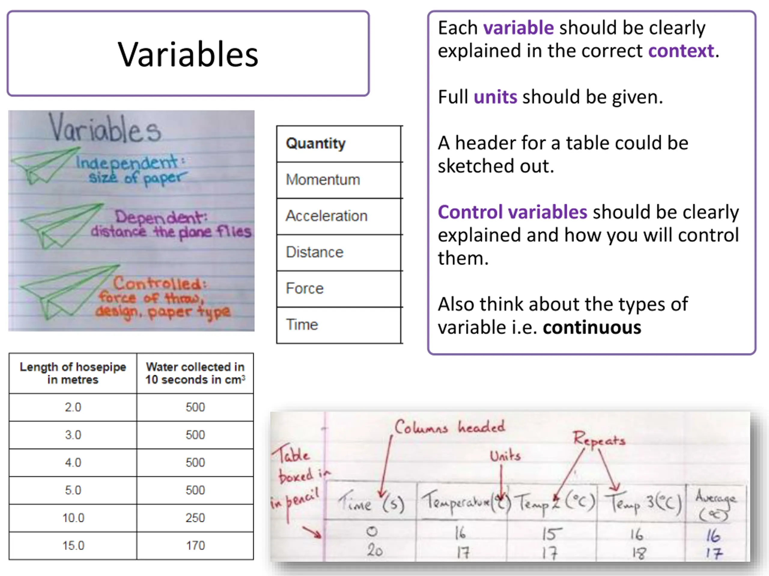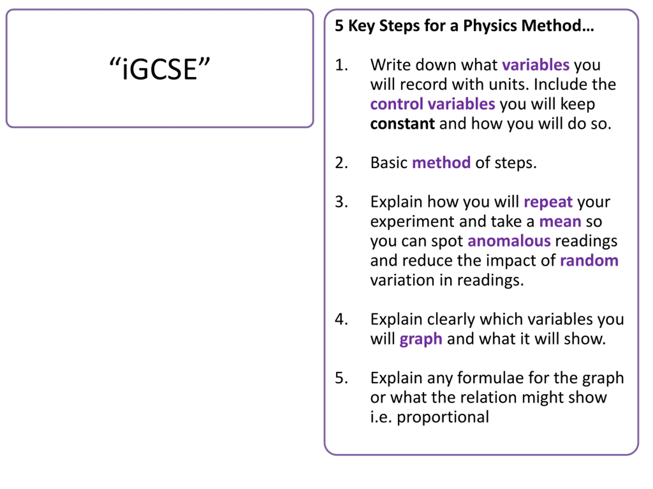 5 Key Steps for a Physics Method iGCSE 1. Write down what variables you will record with units. Include the controlvariables you will keep constant and how you will do so. 2. Basic method of steps. 3. Explain how you will repeat your experiment and take a mean so you can spot anomalous readings and reduce the impact of random variation in readings. 4. Explain clearly which variables you will graph and what it will show. 5. Explain any formulae for the graph or what the relation might show i.e. proportional