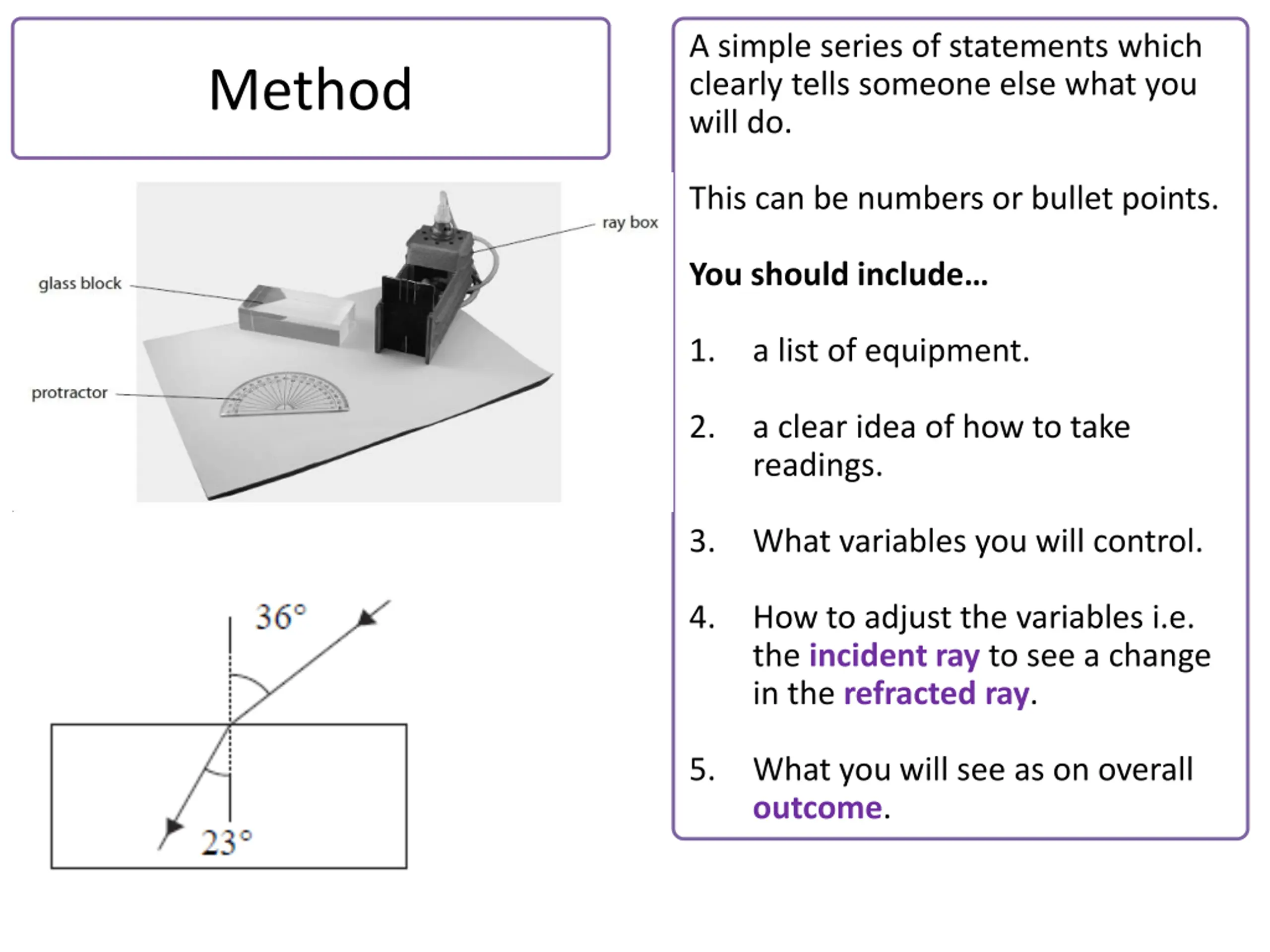 A simple series of statements which clearly tells someone else what you will do. Method This can be numbers or bullet points. You should include 1. a list of equipment. 2. a clear idea of how to take readings. 3. What variables you will control. 4. How to adjust the variables i.e. the incident ray to see a change in the refracted ray. 5. What you will see as on overall outcome.