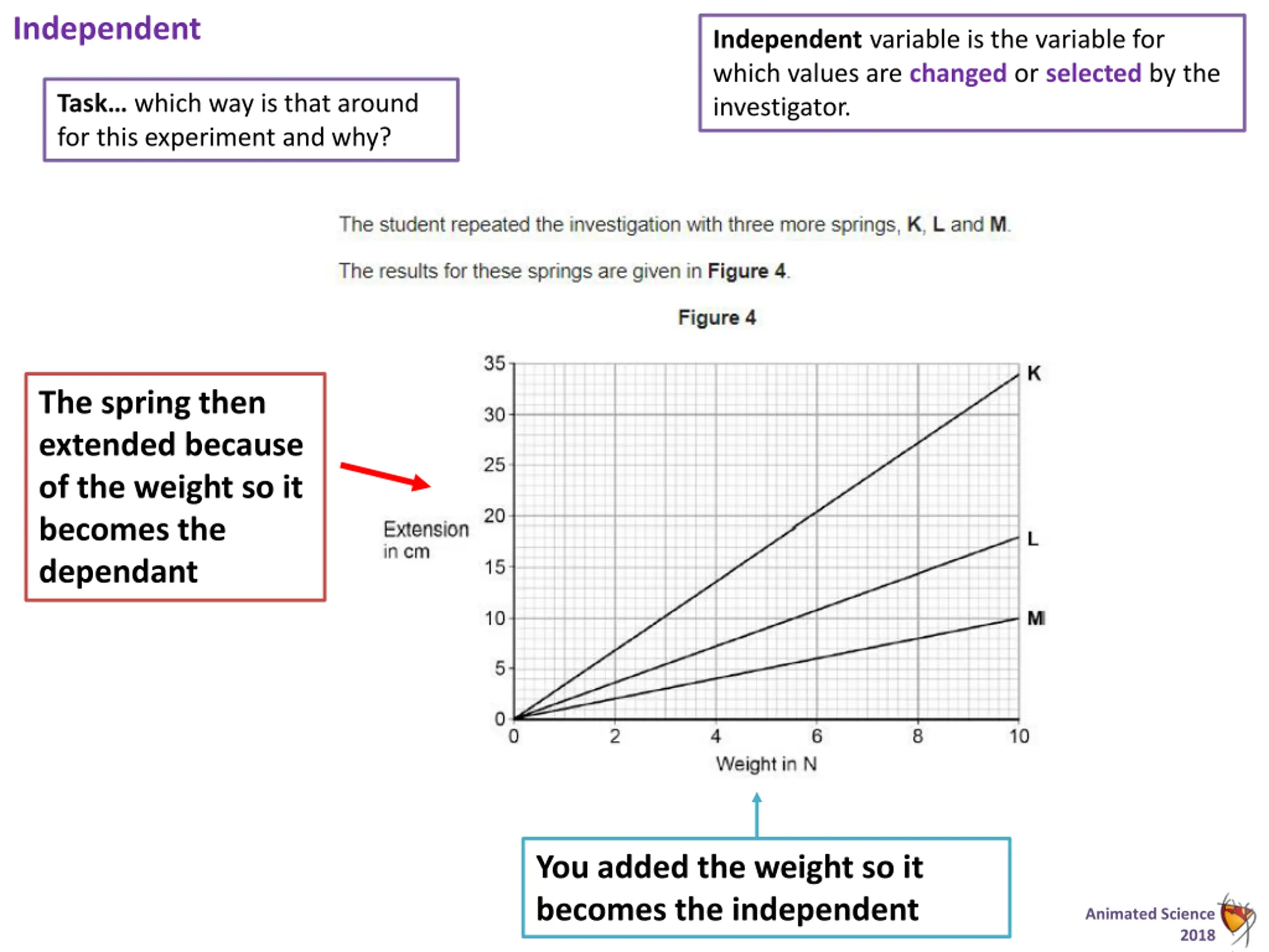Independent Independent variable is the variable for which values are changed or selected by the investigator. Task which way is that around for this experiment and why? The spring then extended because of the weight so it becomes the dependant You added the weight so it becomes the independent Animated Science 2018