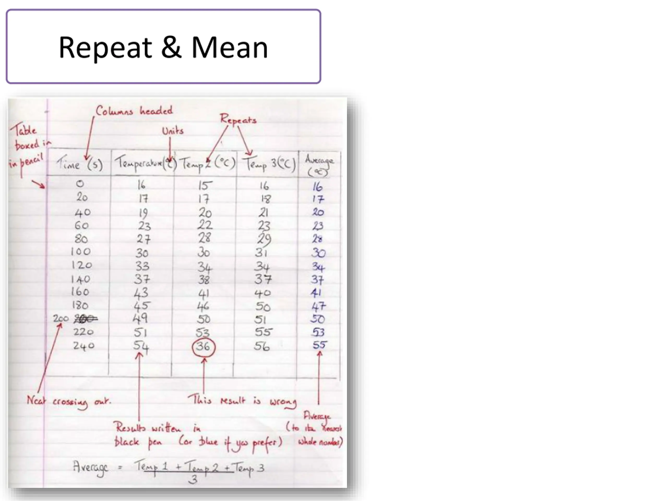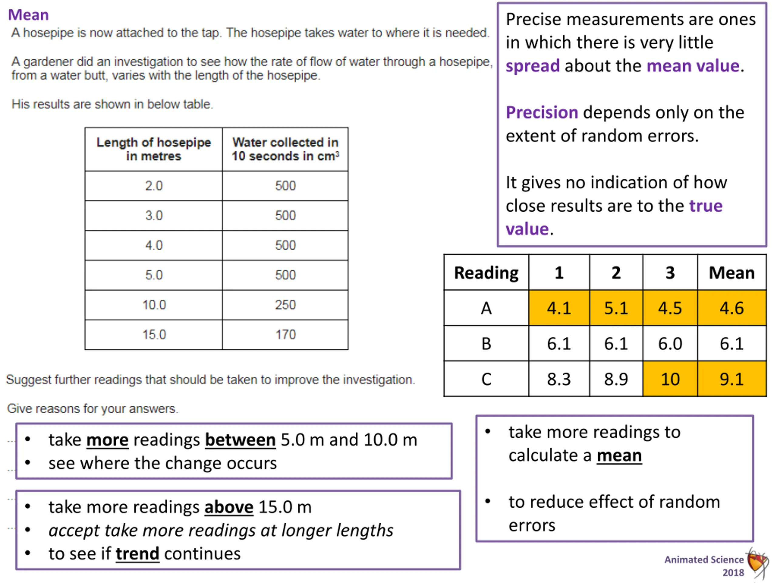 Mean Precise measurements are ones in which there is very little spread about the mean value. Precision depends only on the extent of random errors. It gives no indication of how close results are to the true value. Reading 1 2 3 Mean A 4.1 5.1 4.5 4.6 B 6.1 6.1 6.0 6.1 C 8.3 8.9 10 9.1 take more readings to calculate a mean take more readings between 5.0 m and 10.0 m see where the change occurs to reduce effect of random errors take more readings above 15.0 m accept take more readings at longer lengths to see if trend continues Animated Science 2018