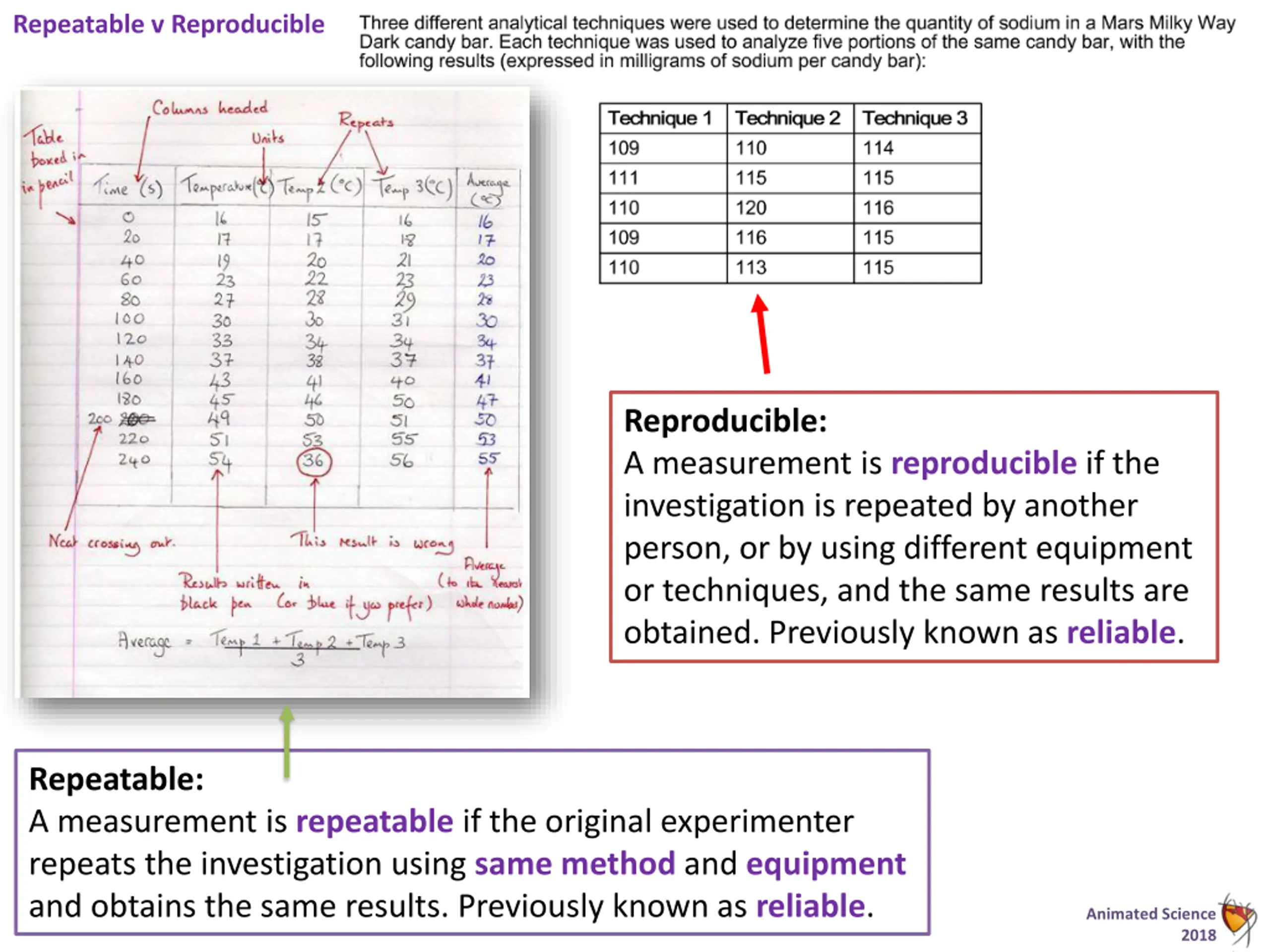 Repeatable v Reproducible Reproducible: A measurement is reproducible if the investigation is repeated by another person, or by using different equipment or techniques, and the same results are obtained. Previously known as reliable. Repeatable: A measurement is repeatable if the original experimenter repeats the investigation using same method and equipment and obtains the same results. Previously known as reliable. Animated Science 2018