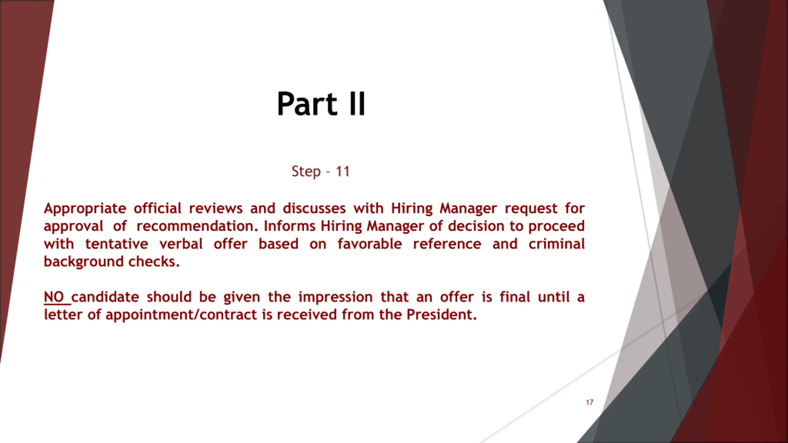 Part II Step 11 Appropriate official reviews and discusses with Hiring Manager request for approval of recommendation. Informs Hiring Manager of decision to proceed with tentative verbal offer based on favorable reference and criminal background checks. NO candidate should be given the impression that an offer is final until a letter of appointment/contract is received from the President. 17