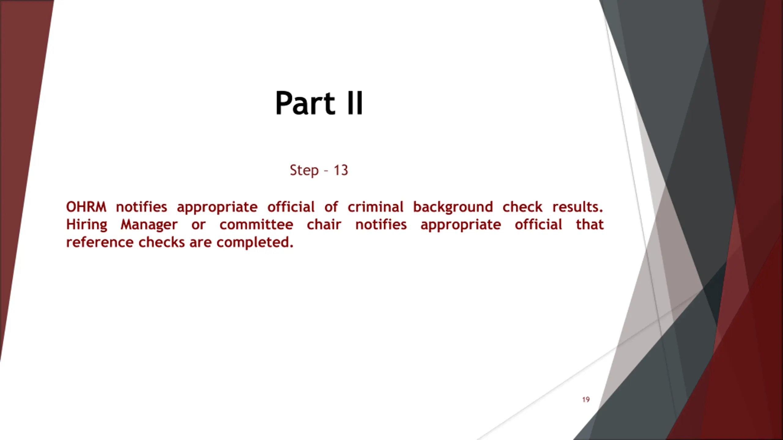 Part II Step 13 OHRM notifies appropriate official of criminal background check results. Hiring Manager or committee chair notifies appropriate official that reference checks are completed. 19