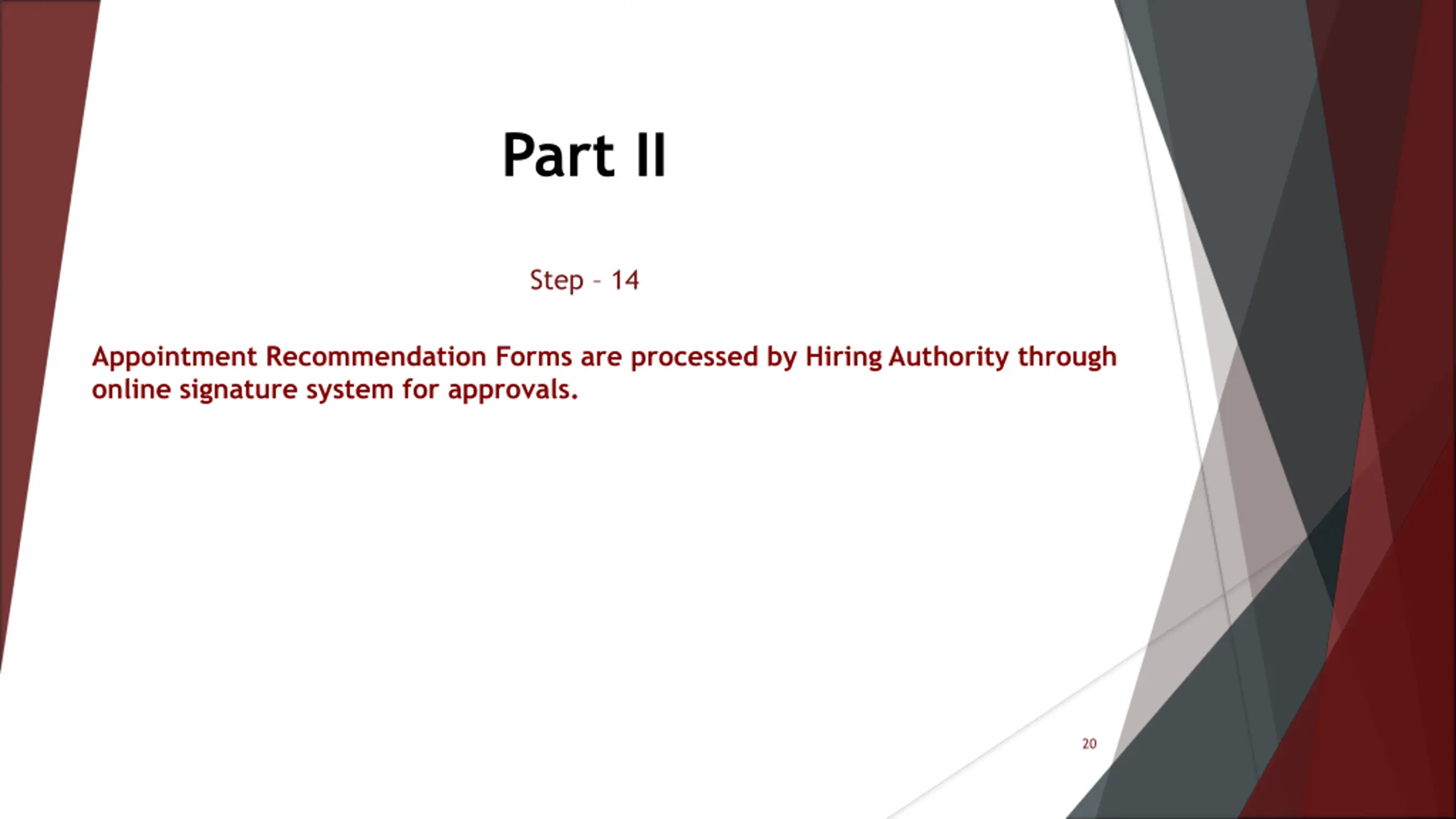 Part II Step 14 Appointment Recommendation Forms are processed by Hiring Authority through online signature system for approvals. 20