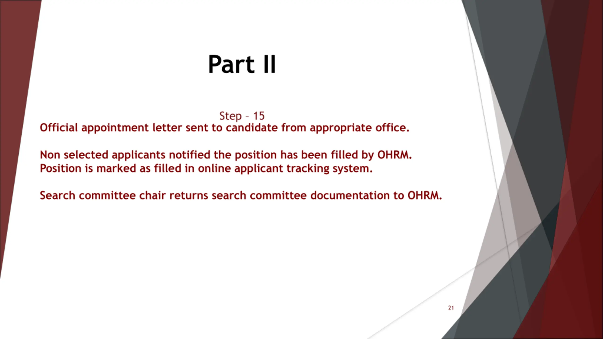 Part II Step 15 Official appointment letter sent to candidate from appropriate office. Non selected applicants notified the position has been filled by OHRM. Position is marked as filled in online applicant tracking system. Search committee chair returns search committee documentation to OHRM. 21