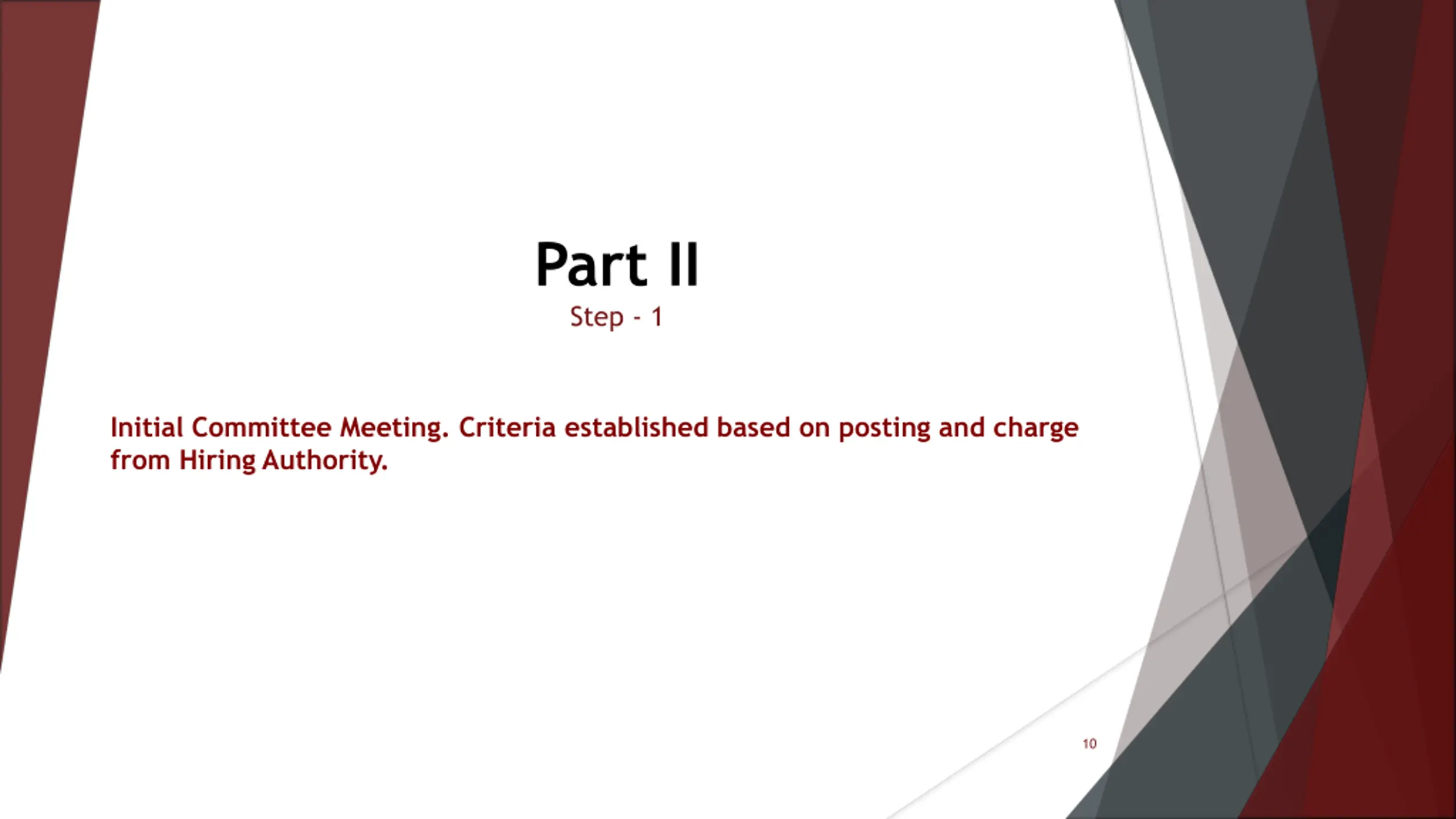 Part II Step - 1 Initial Committee Meeting. Criteria established based on posting and charge from Hiring Authority. 10