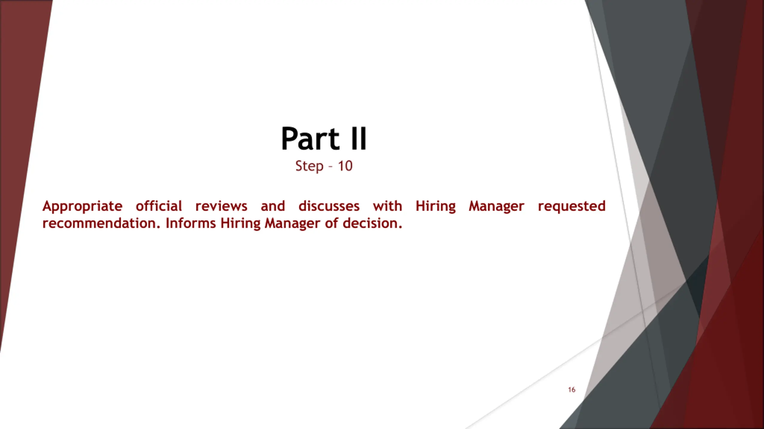 Part II Step 10 Appropriate official reviews and discusses with Hiring Manager requested recommendation. Informs Hiring Manager of decision. 16