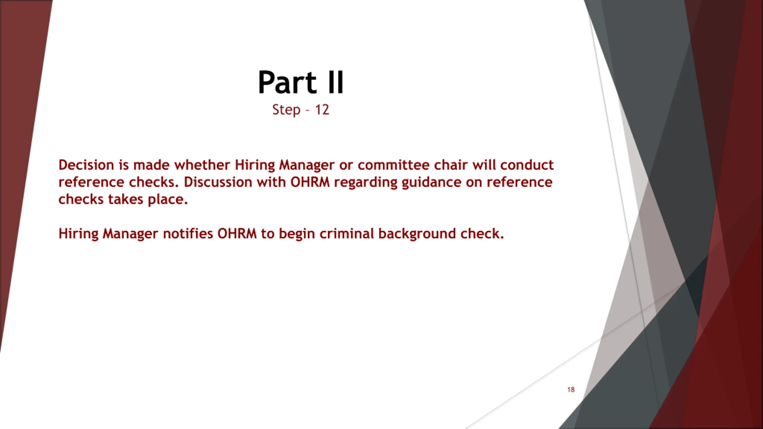 Part II Step 12 Decision is made whether Hiring Manager or committee chair will conduct reference checks. Discussion with OHRM regarding guidance on reference checks takes place. Hiring Manager notifies OHRM to begin criminal background check. 18