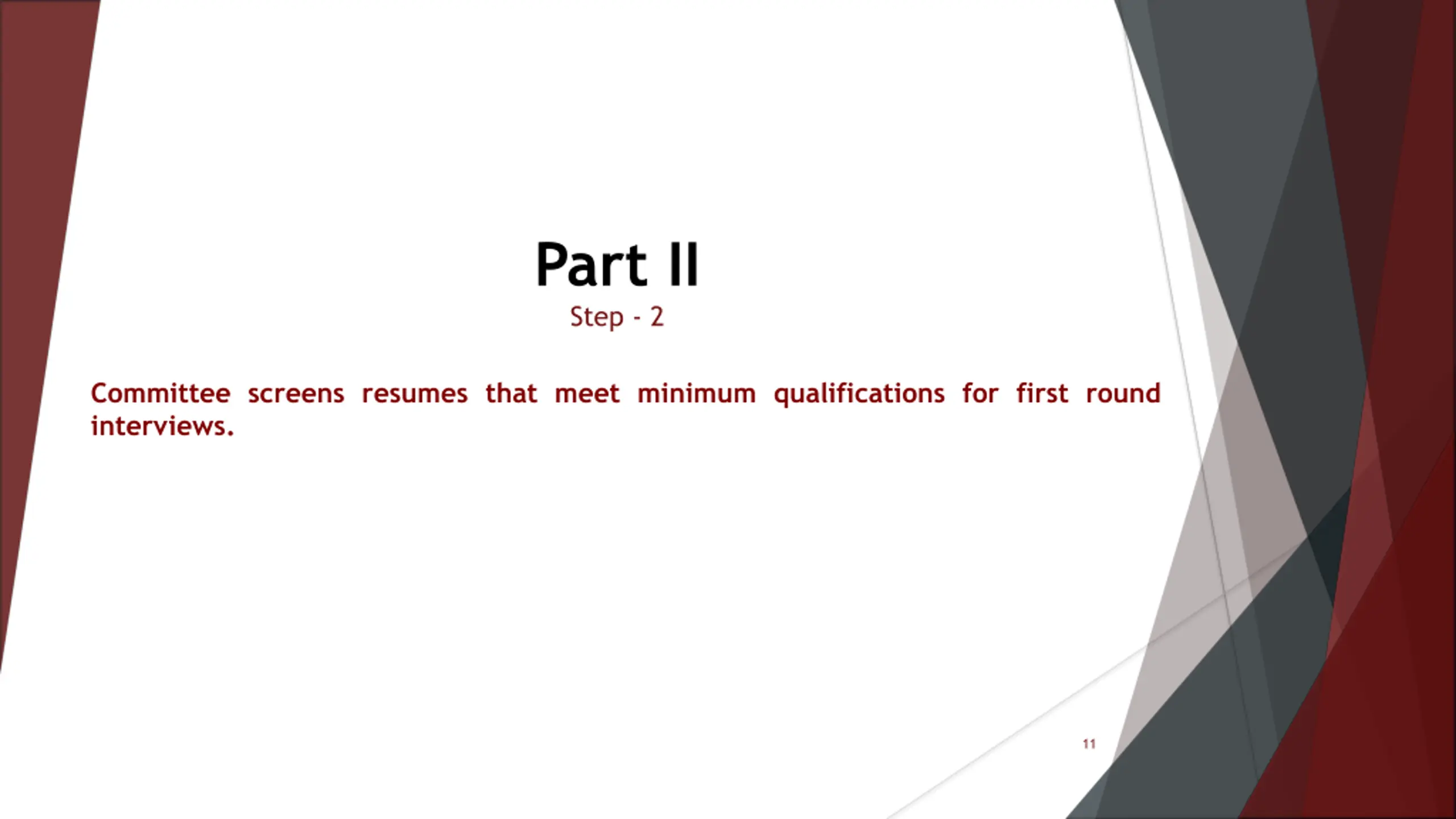 Part II Step - 2 Committee screens resumes that meet minimum qualifications for first round interviews. 11
