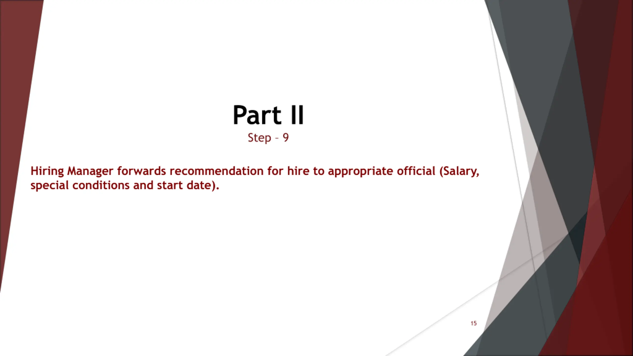 Part II Step 9 Hiring Manager forwards recommendation for hire to appropriate official (Salary, special conditions and start date). 15