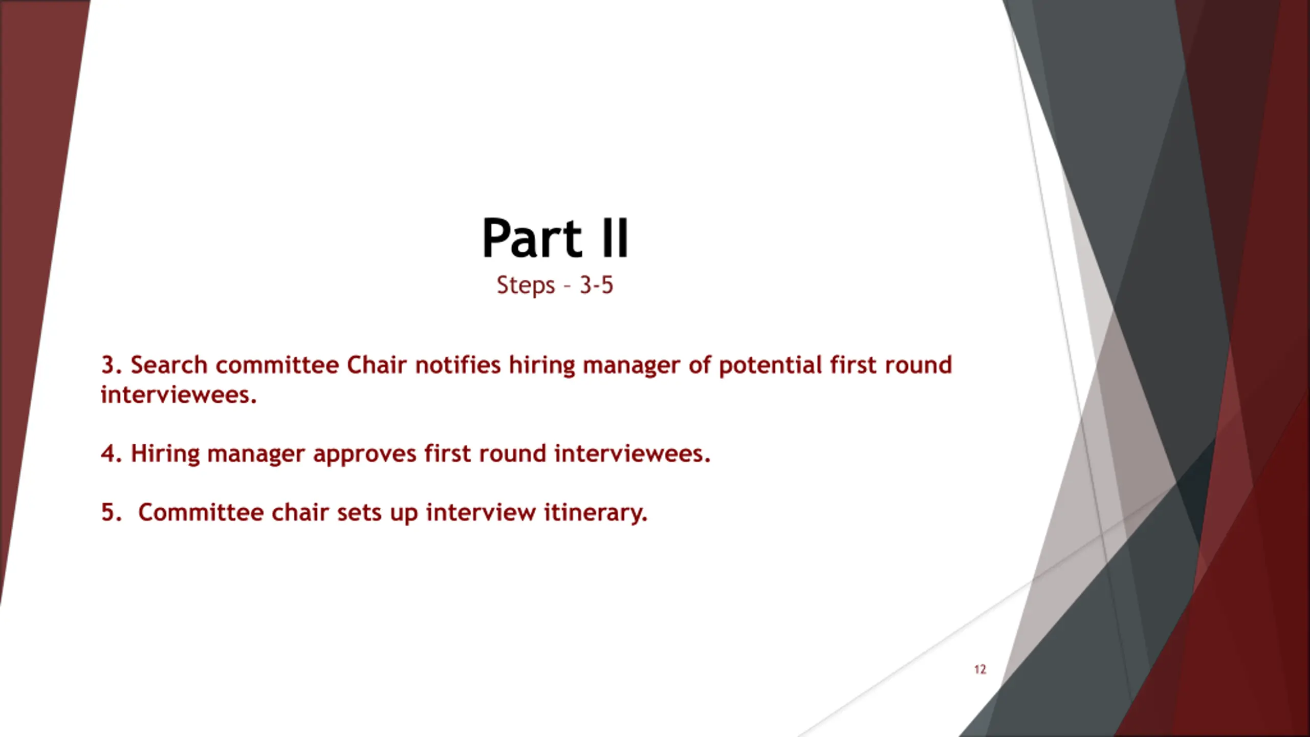 Part II Steps 3-5 3. Search committee Chair notifies hiring manager of potential first round interviewees. 4. Hiring manager approves first round interviewees. 5. Committee chair sets up interview itinerary. 12