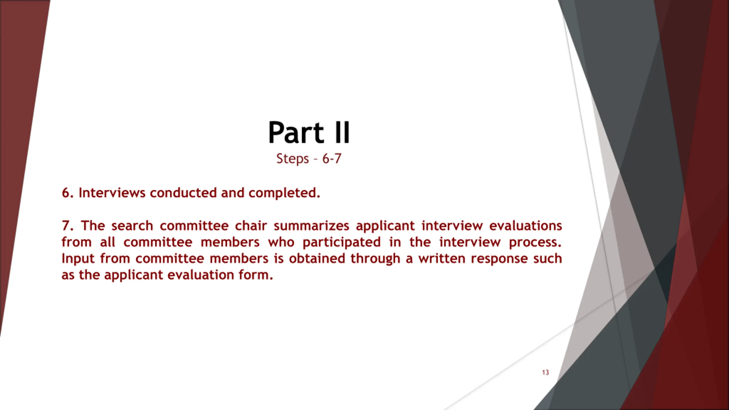 Part II Steps 6-7 6. Interviews conducted and completed. 7.The search committee chair summarizes applicant interview evaluations from all committee members who participated in the interview process. Input from committee members is obtained through a written response such as the applicant evaluation form. 13