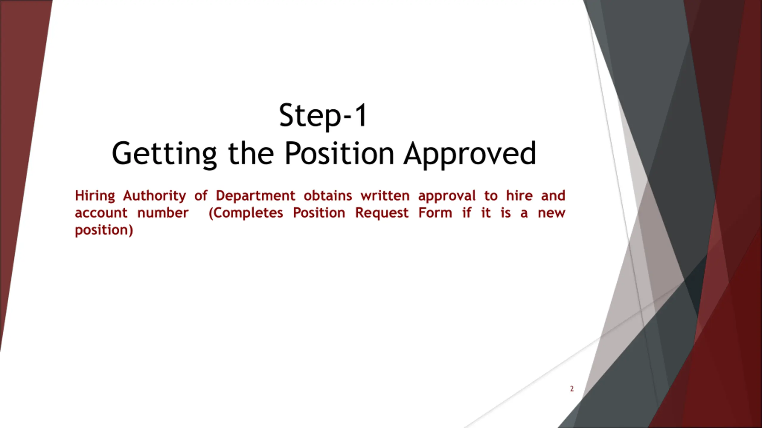 Step-1 Getting the Position Approved Hiring Authority of Department obtains written approval to hire and account number (Completes Position Request Form if it is a new position) 2