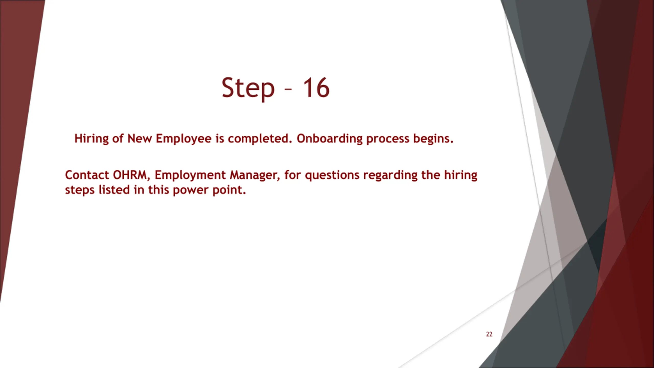 Step 16 Hiring of New Employee is completed. Onboarding process begins. Contact OHRM, Employment Manager, for questions regarding the hiring steps listed in this power point. 22