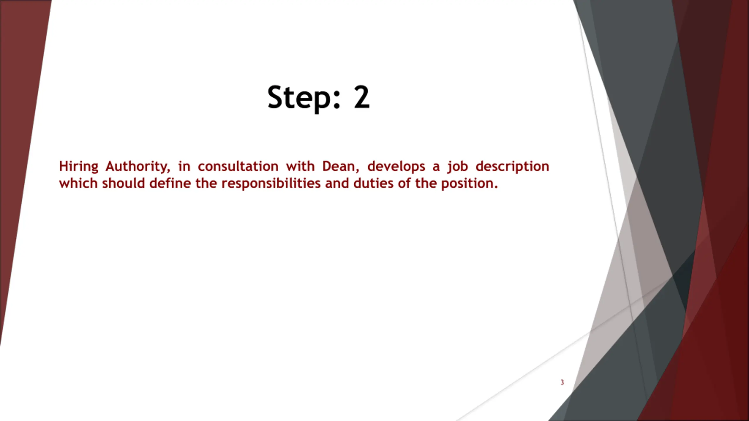Step: 2 Hiring Authority, in consultation with Dean, develops a job description which should define the responsibilities and duties of the position. 3