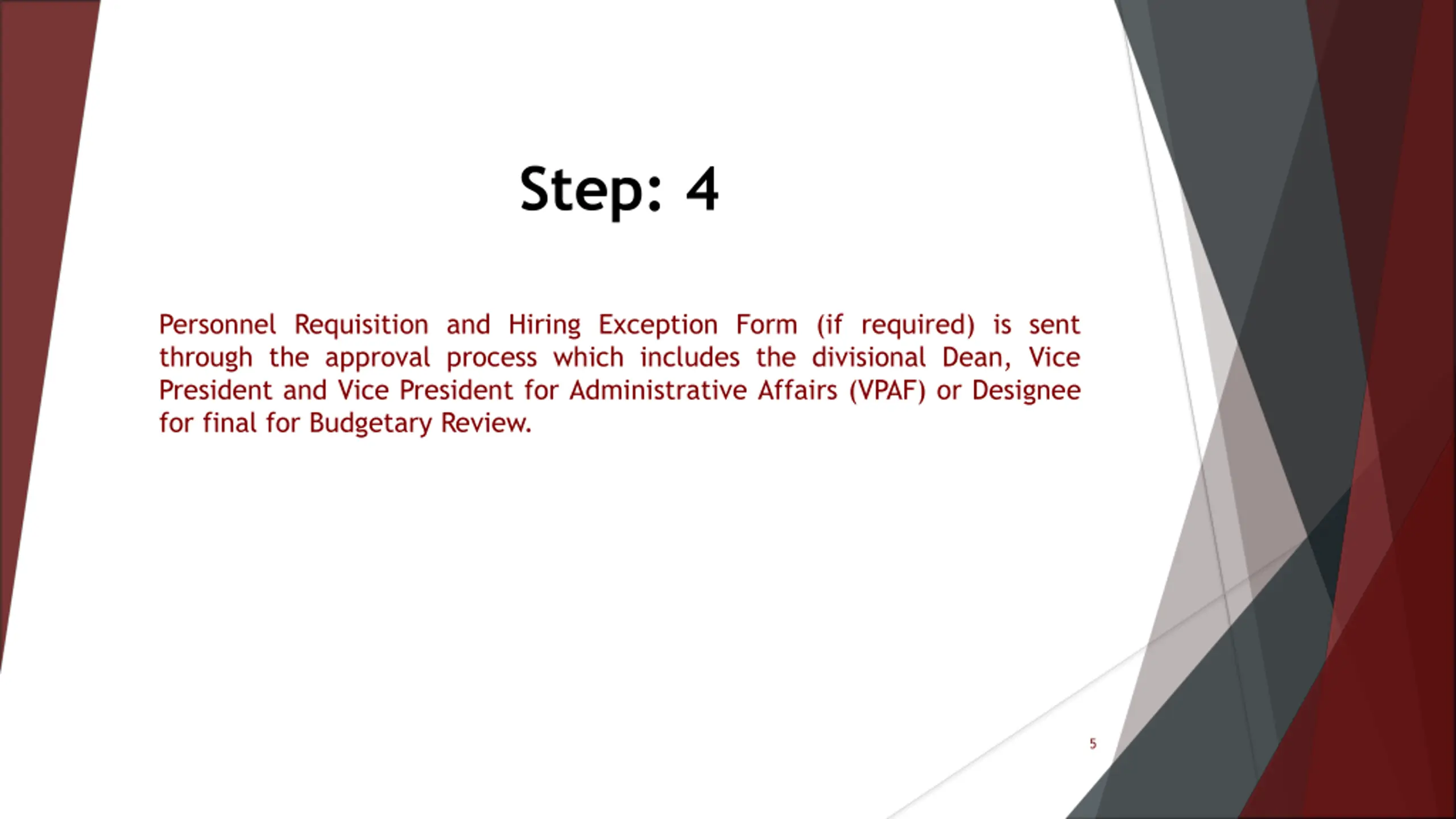 Step: 4 Personnel Requisition and Hiring Exception Form (if required) is sent through the approval process which includes the divisional Dean, Vice President and Vice President for Administrative Affairs (VPAF) or Designee for final for Budgetary Review. 5