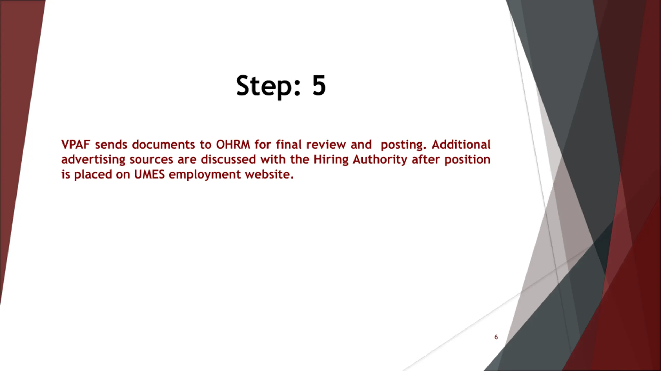 Step: 5 VPAF sends documents to OHRM for final review and posting. Additional advertising sources are discussed with the Hiring Authority after position is placed on UMES employment website. 6