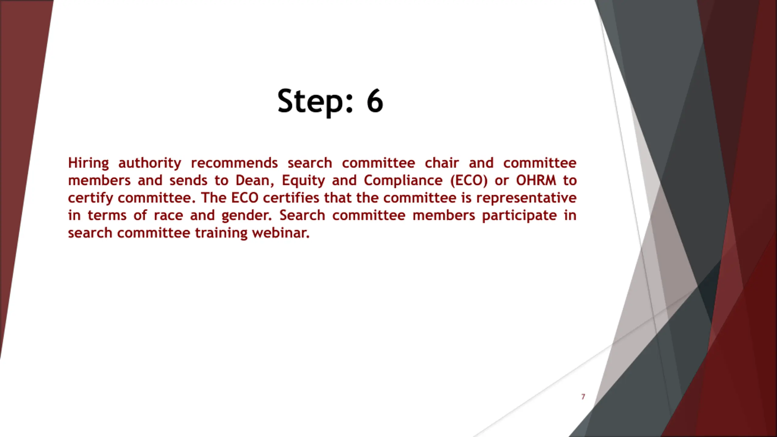 Step: 6 Hiring authority recommends search committee chair and committee members and sends to Dean, Equity and Compliance (ECO) or OHRM to certify committee. The ECO certifies that the committee is representative in terms of race and gender. Search committee members participate in search committee training webinar. 7