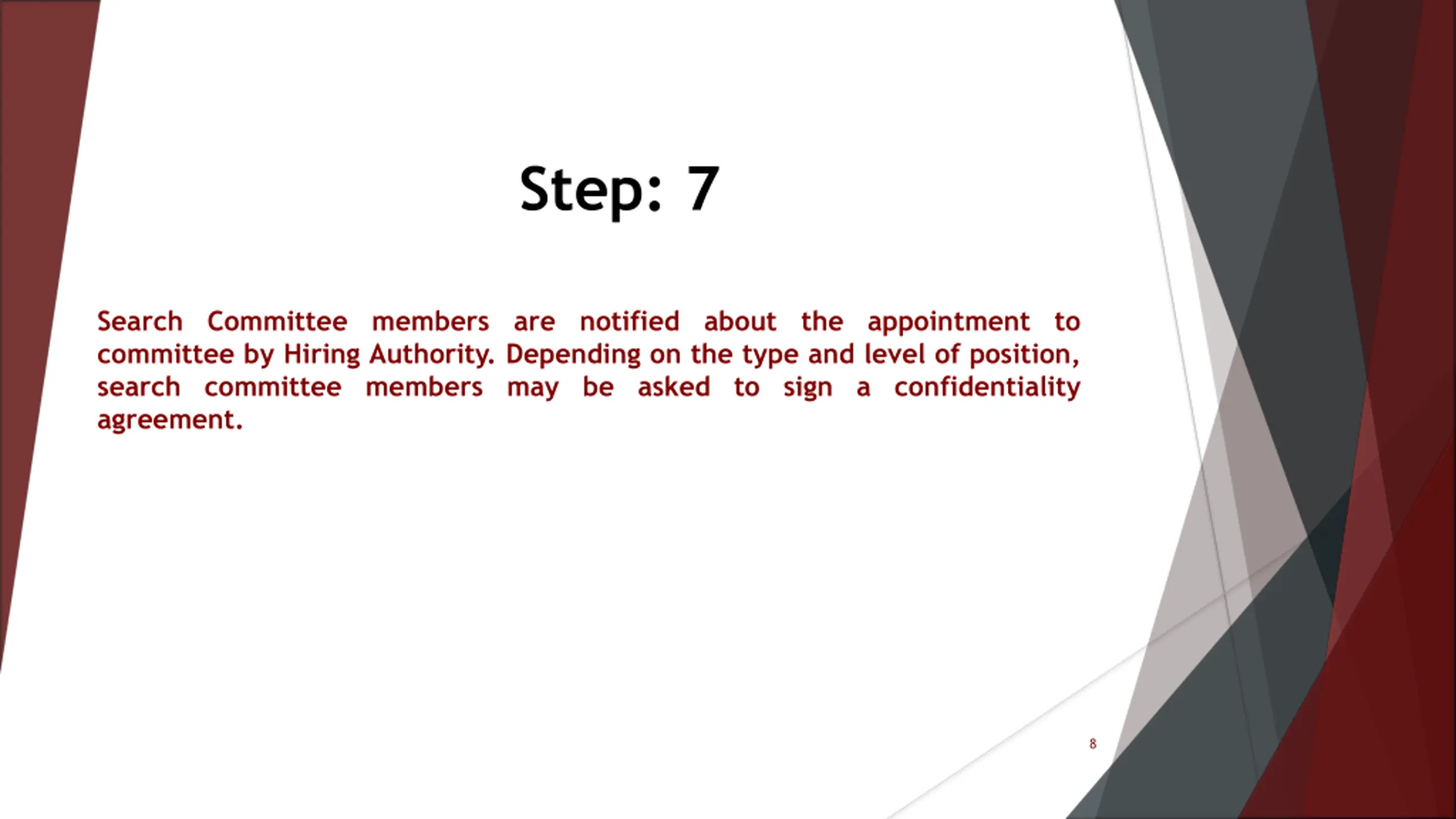 Step: 7 Search Committee members are notified about the appointment to committee by Hiring Authority. Depending on the type and level of position, search committee members may be asked to sign a confidentiality agreement. 8