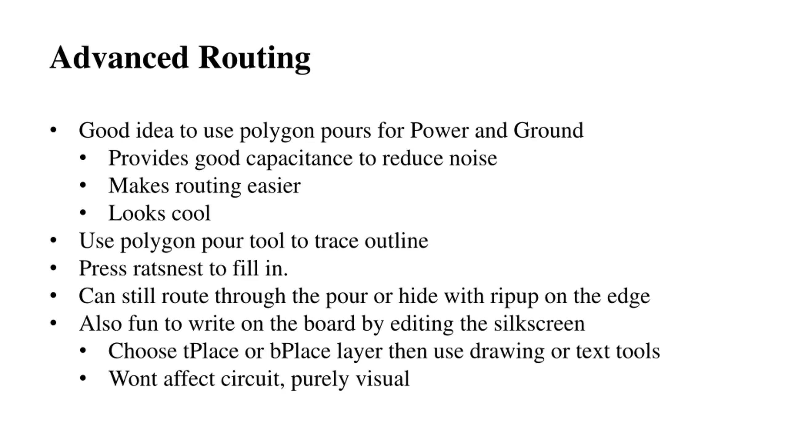 Advanced Routing Good idea to use polygon pours for Power and Ground Provides good capacitance to reduce noise Makes routing easier Looks cool Use polygon pour tool to trace outline Press ratsnest to fill in. Can still route through the pour or hide with ripup on the edge Also fun to write on the board by editing the silkscreen Choose tPlace or bPlace layer then use drawing or text tools Wont affect circuit, purely visual