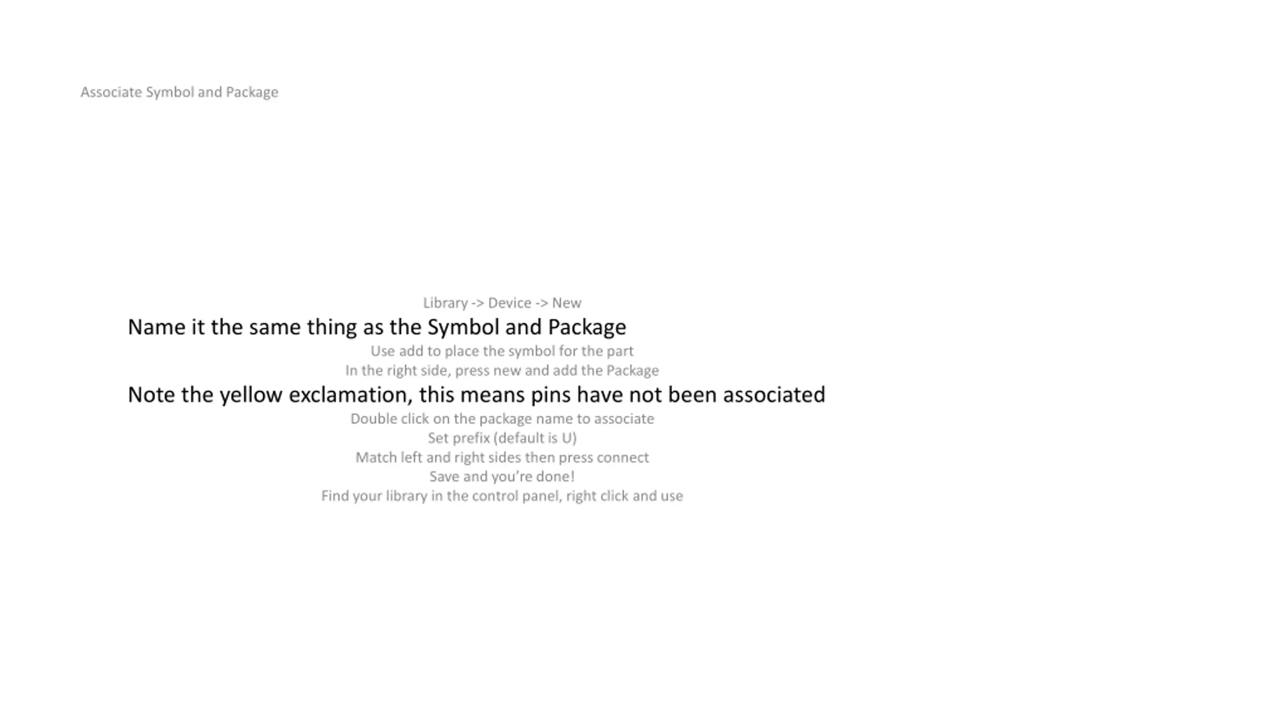 Associate Symbol and Package Library -> Device -> New Name it the same thing as the Symbol and Package Use add to place the symbol for the part In the right side, press new and add the Package Note the yellow exclamation, this means pins have not been associated Double click on the package name to associate Set prefix (default is U) Match left and right sides then press connect Save and you re done! Find your library in the control panel, right click and use